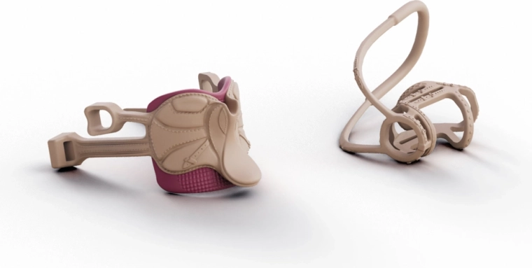 Sella e briglia rimovibili, casco per la cavallerizza e accessori coordinati per cambiare facilmente scene e storie.