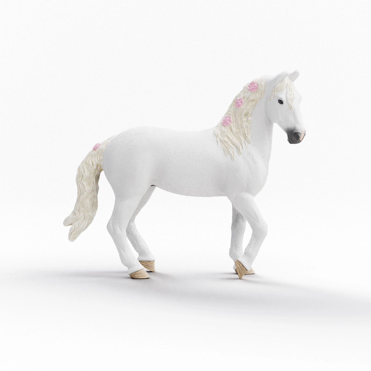 Cavallo bianco come la neve con criniera lavorata nei dettagli, finimenti realistici e postura stabile per esposizione e gioco.