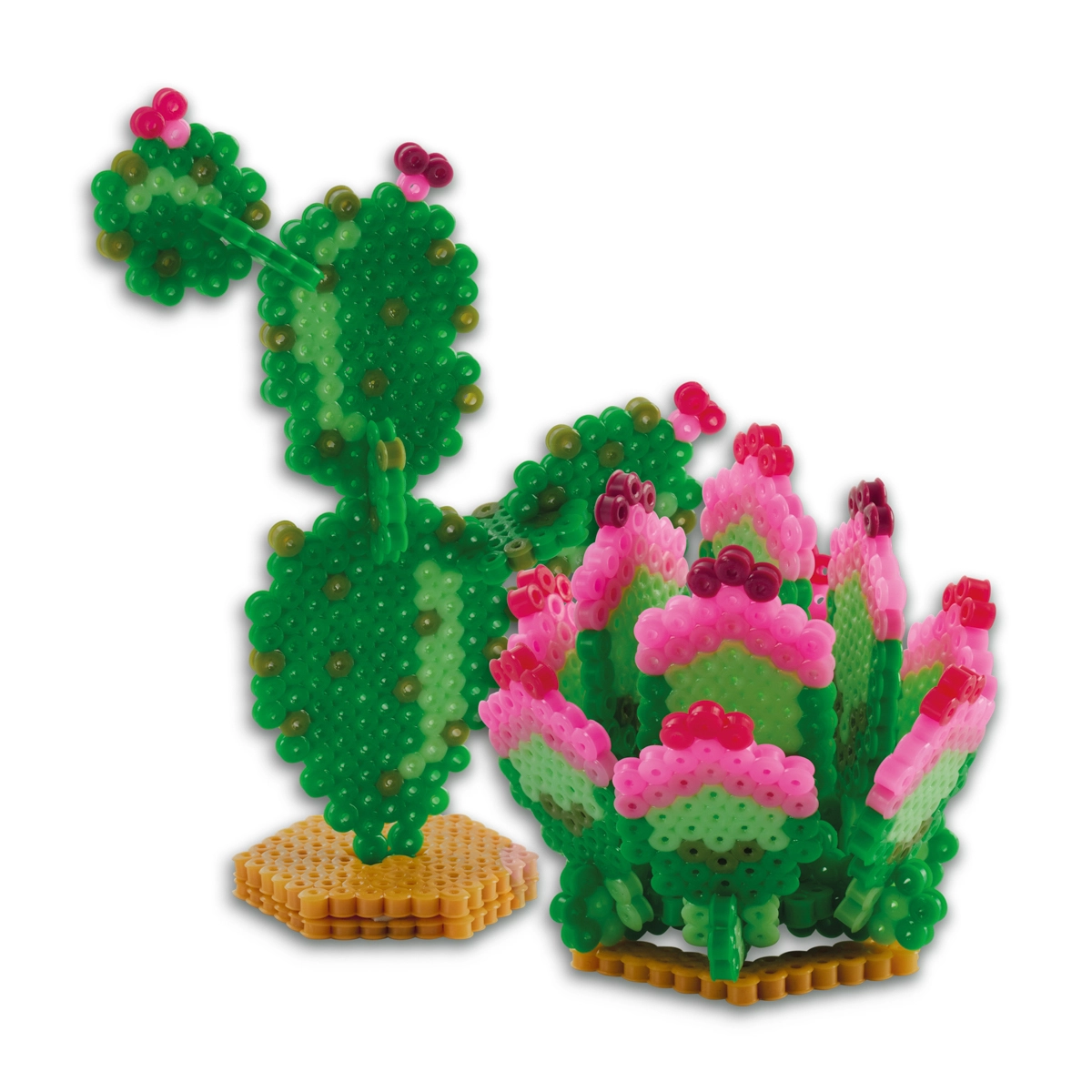 Questo set creativo porta un tocco di natura direttamente sulla tua scrivania. Grazie allo speciale stratificato 3D creerai cactus, fiori e foglie d'effetto, che dopo la stiratura mantengono la forma e possono essere esposti. Le perline colorate si dispongono sulla base esagonale con pioli, poi si stirano tramite la carta inclusa e, con le strisce in gommapiuma, ottengono un realistico effetto tridimensionale.