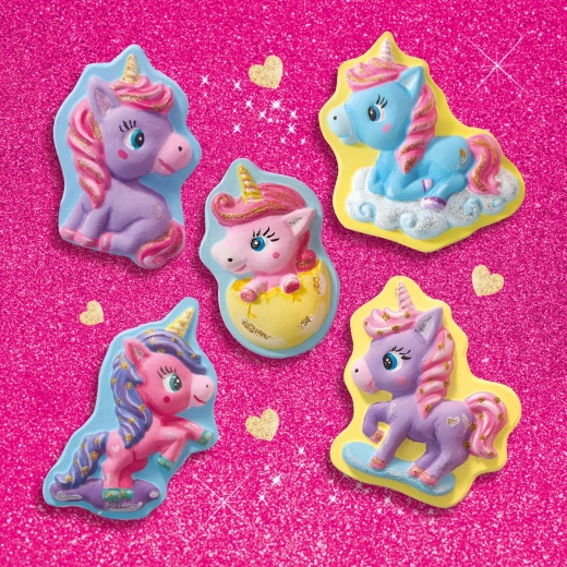 Risvegliate la fantasia e create la vostra collezione di magici cuccioli di unicorno. Grazie allo stampo pratico e al gesso fine, anche i principianti riusciranno nella colata. Successivamente decorate le figurine con colori vivaci oppure trasformatele in delicate tonalità pastello mescolandoli tra loro. Il tocco finale scintillante è garantito dalla colla glitter oro e argento.