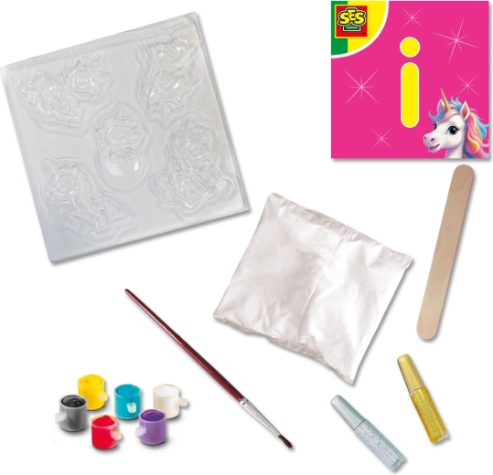 - Stampo per unicorni, 300 g di gesso, spatola in legno, 6 tonalità di colori a tempera, colla glitter oro, colla glitter argento, pennello, istruzioni