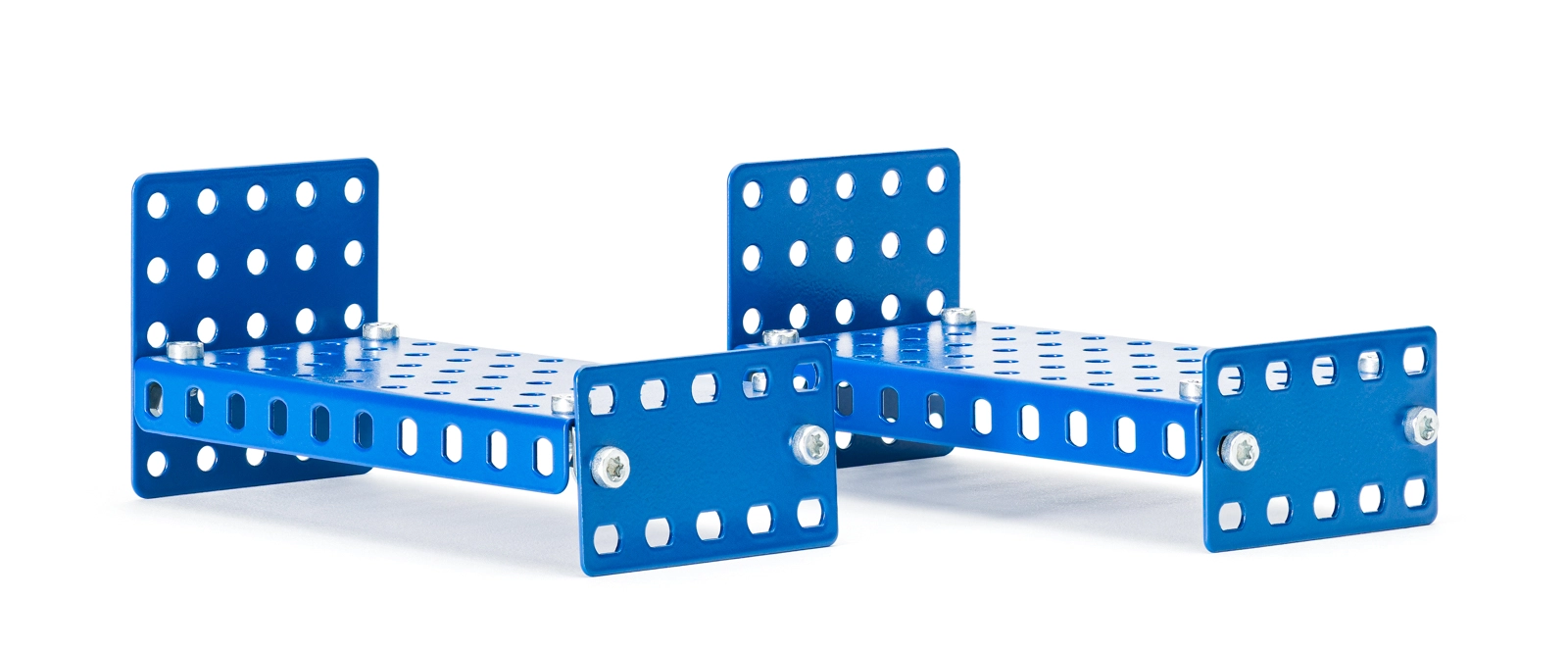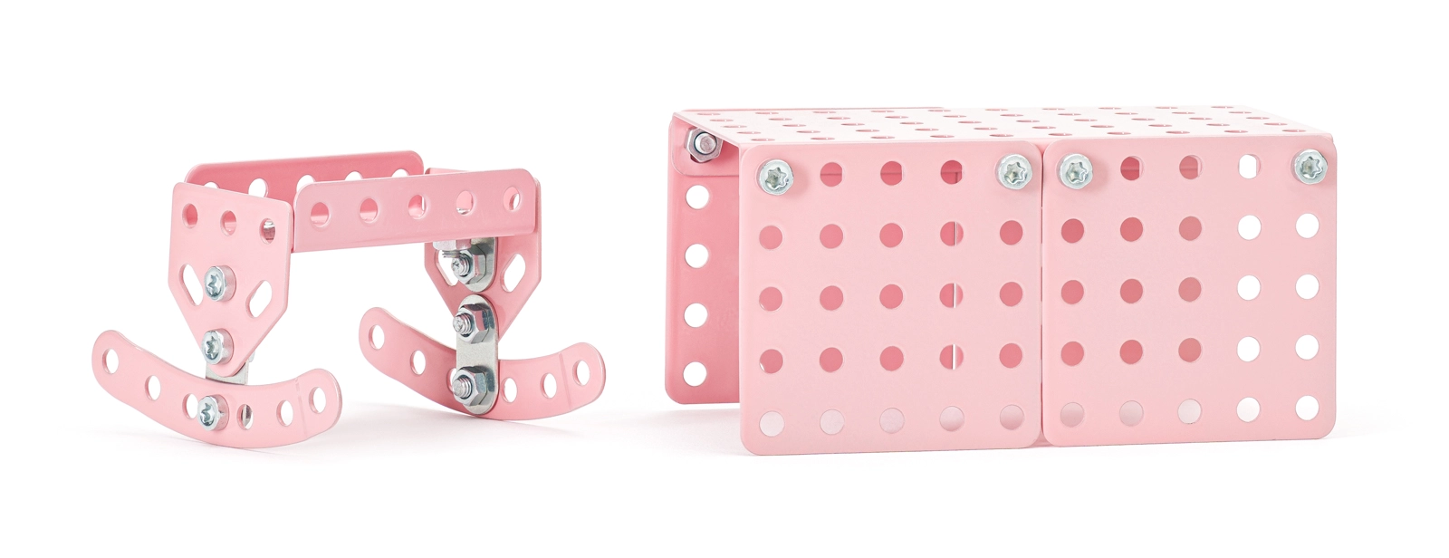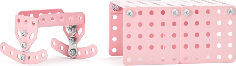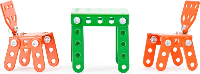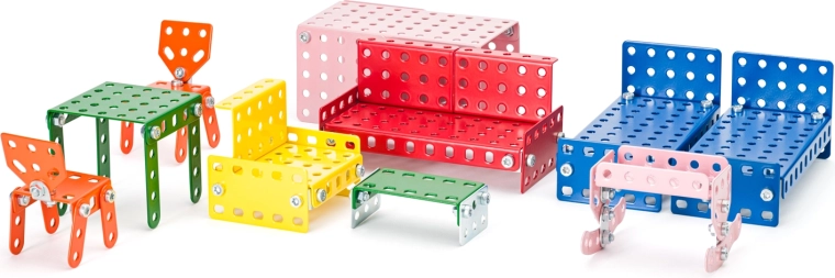 Con il kit in metallo MERKUR i bambini possono assemblare facilmente mobili realistici per la casa delle bambole. I pezzi in metallo robusto si collegano con viti e dadi, così i modelli mantengono la forma, sono stabili e possono essere riconfigurati più e più volte. Grazie ai colori vivaci e agli elementi perforati universali nascono decine di varianti secondo la fantasia.