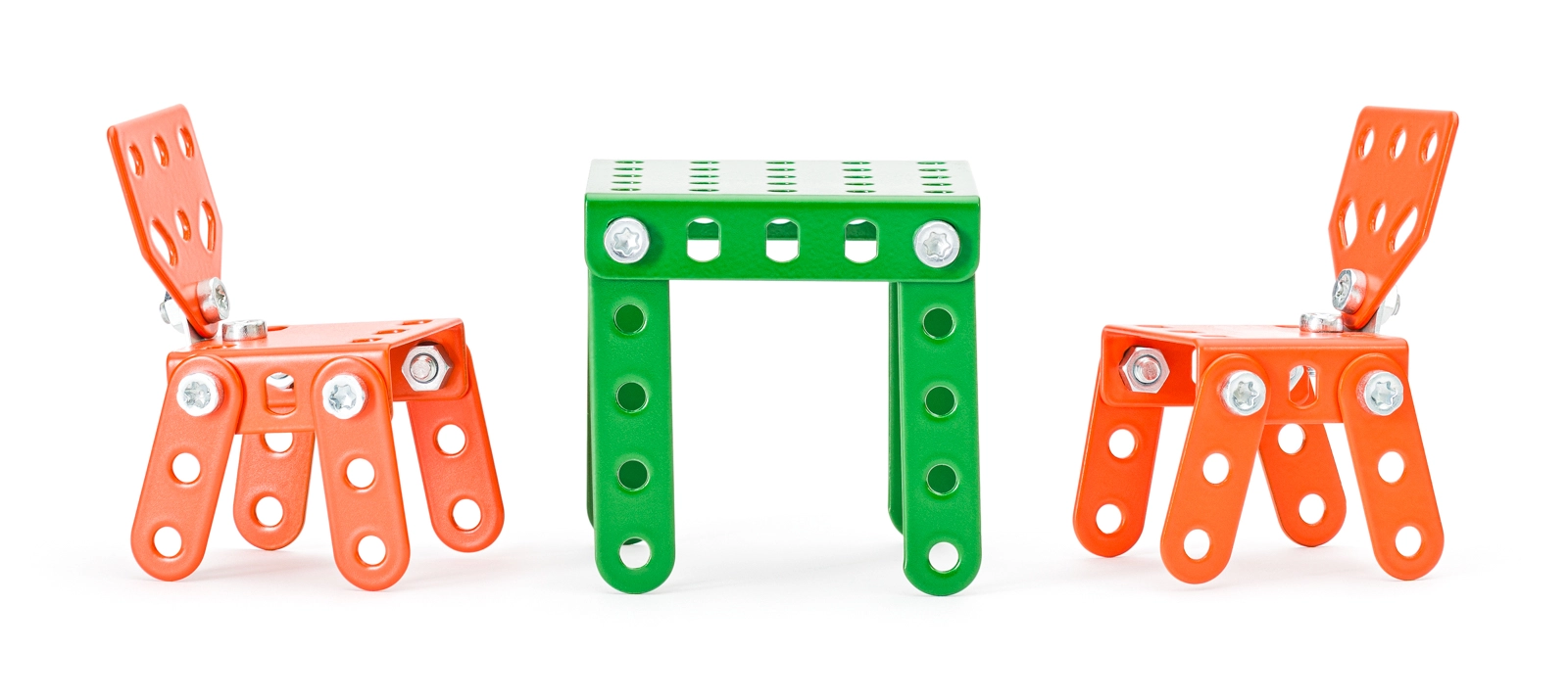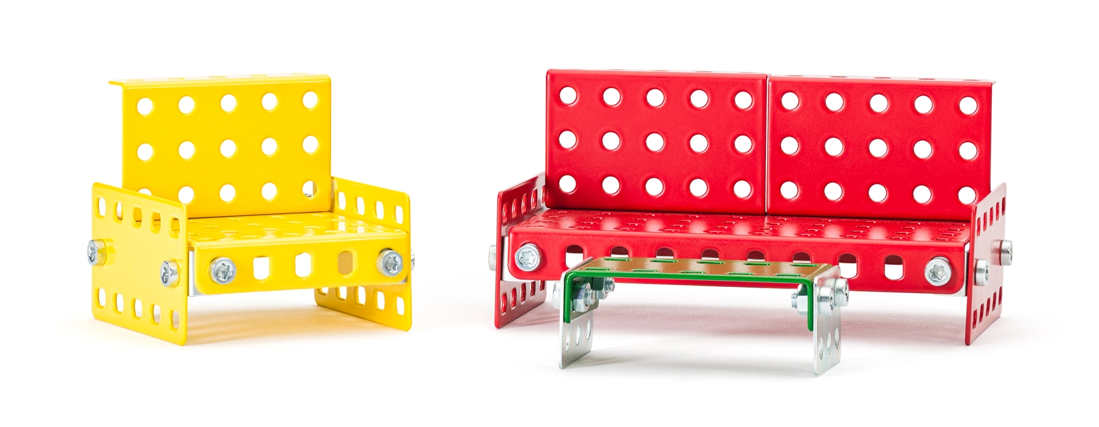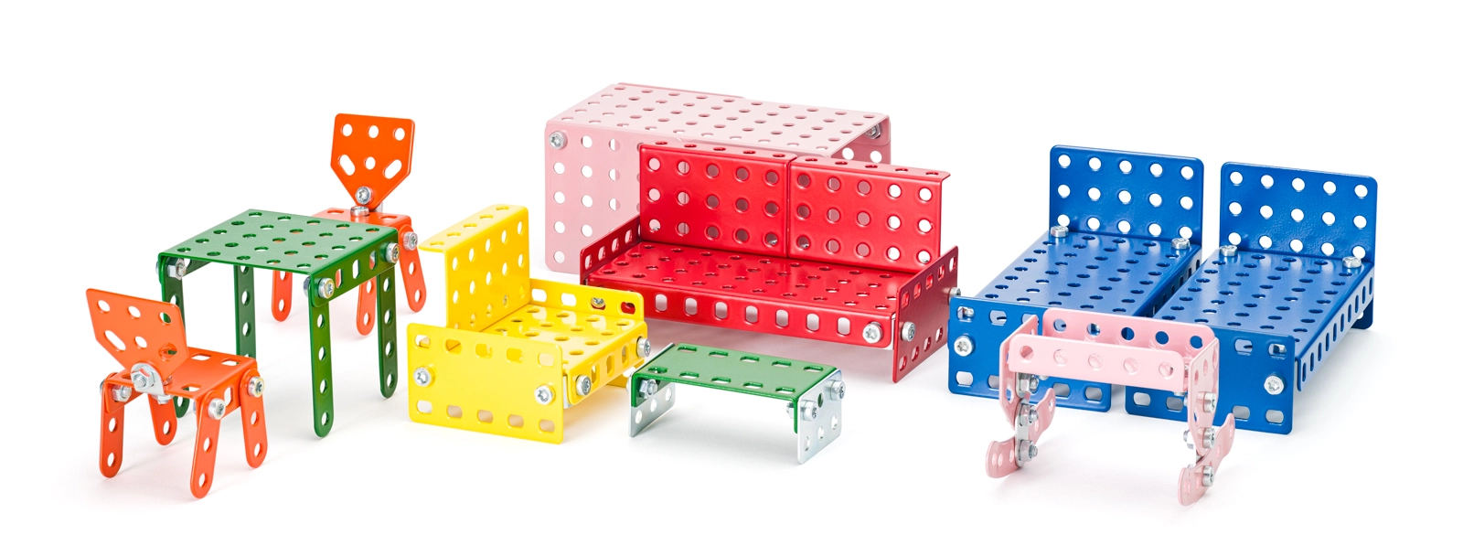Modelli stabili di sedie, tavoli, letti e divano in elementi metallici perforati resistono al gioco intenso e possono essere montati e rimontati più volte.