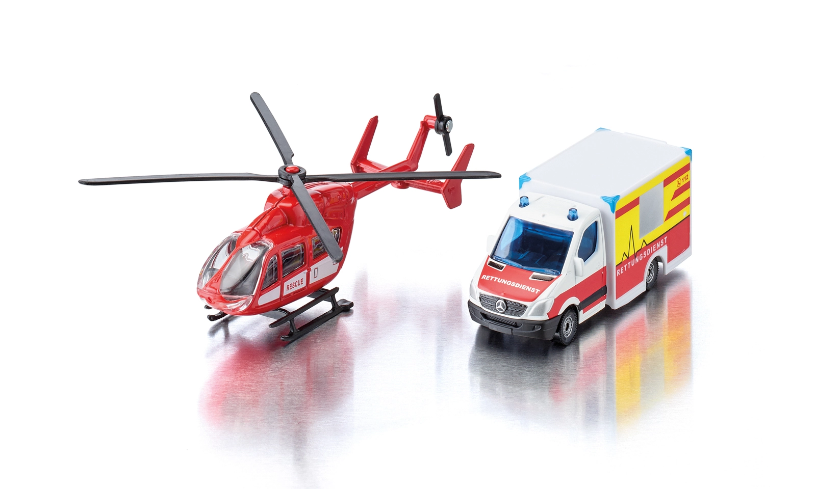 Questo set SIKU dettagliato unisce due componenti chiave del sistema di emergenza – terrestre e aerea. L'ambulanza Mercedes‑Benz colpisce per la livrea autentica, scritte realistiche e segnalazione. L'elicottero EUROCOPTER EC145 offre rotori girevoli, cabina dell'equipaggio ben rifinita e marcature di soccorso per creare scene di gioco realistiche.