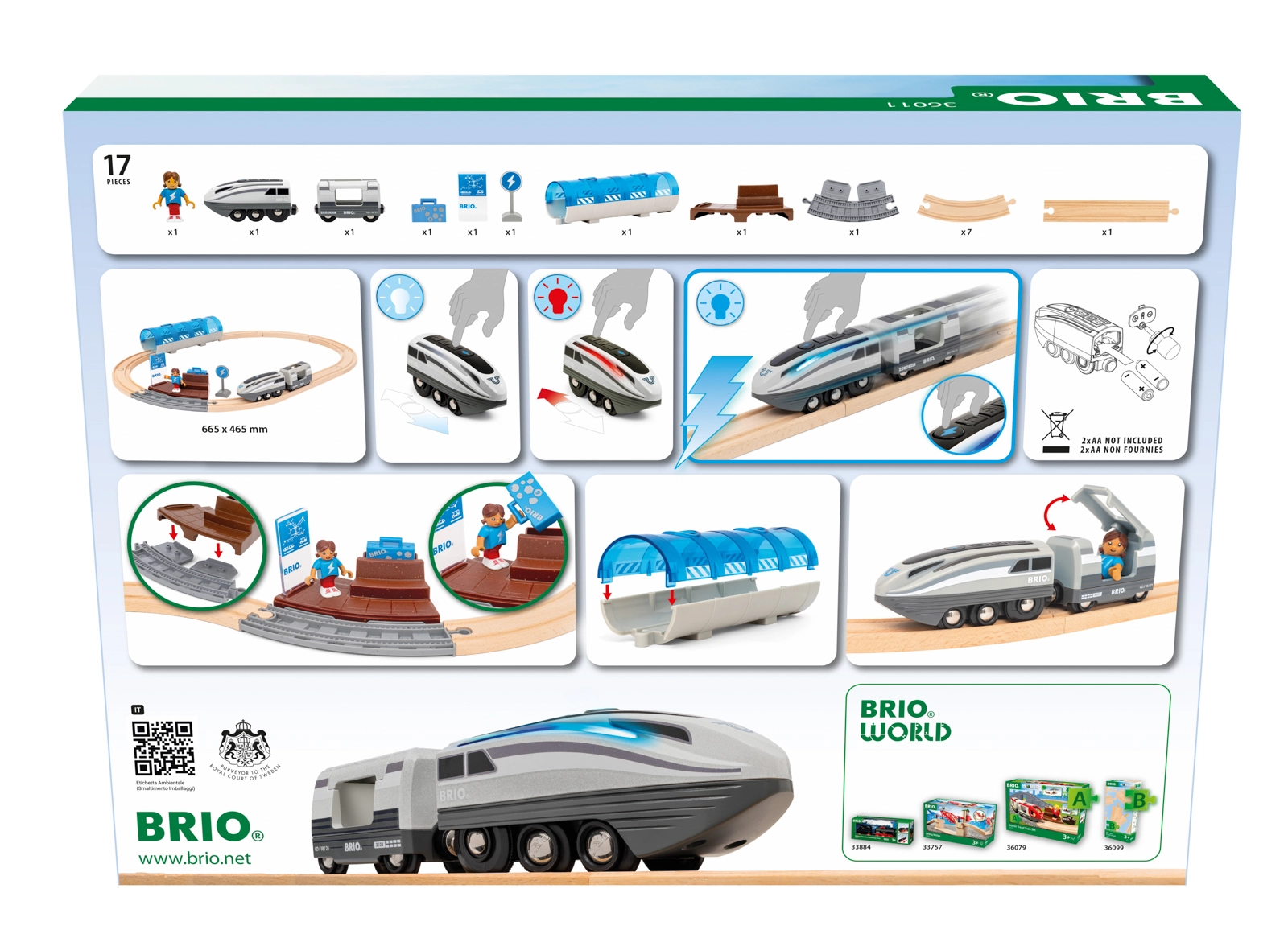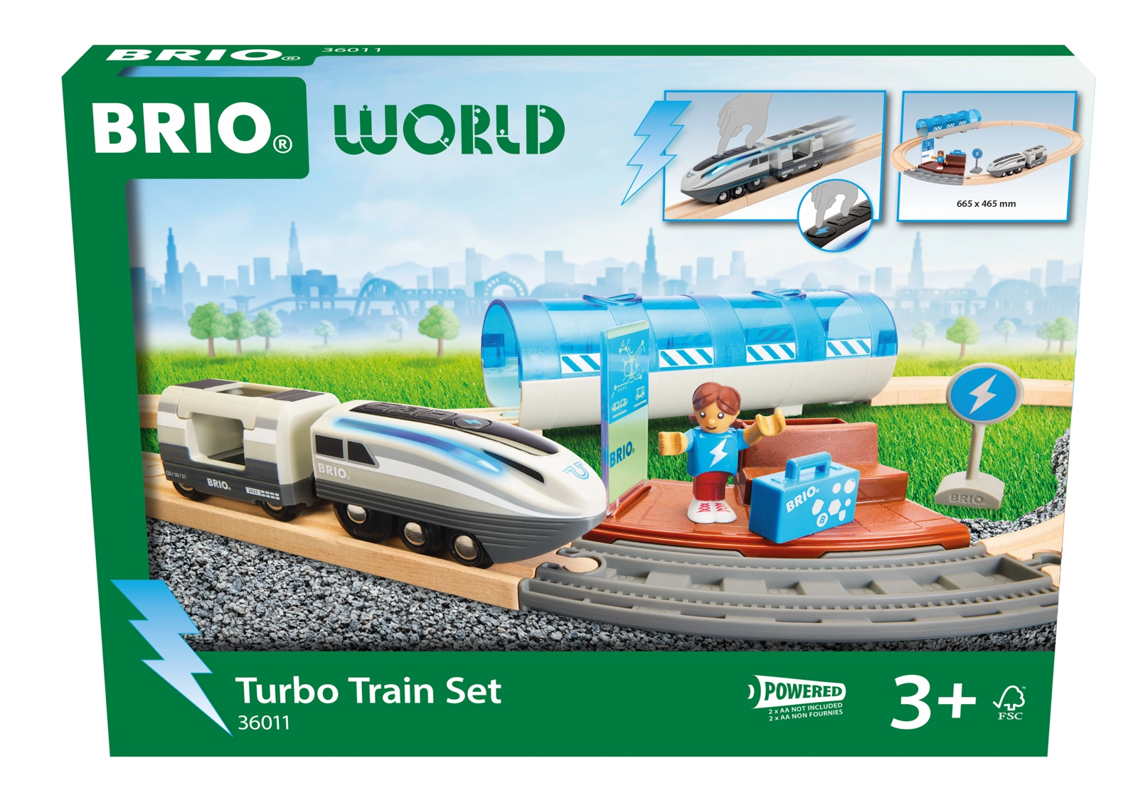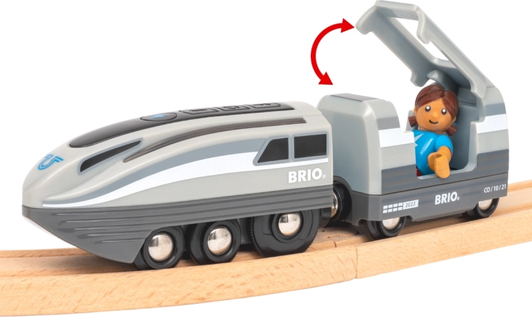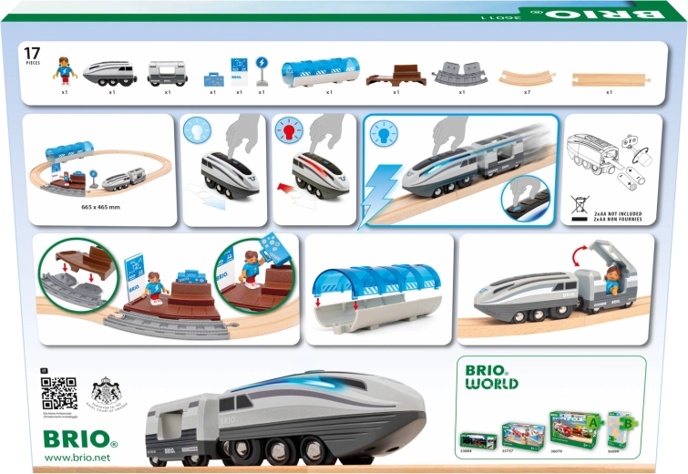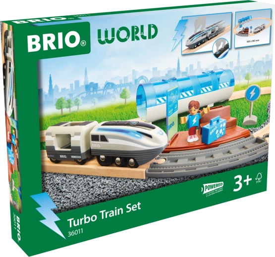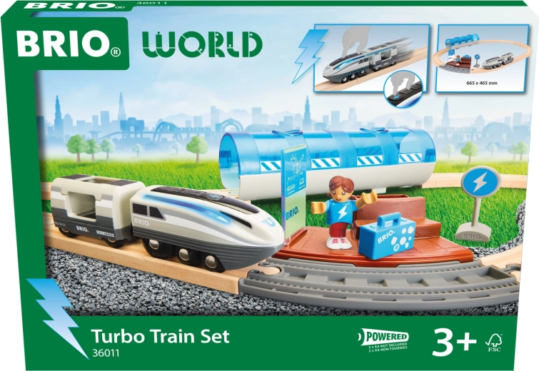 Questo set ferroviario creativo offre un divertimento dinamico: premendo il pulsante Turbo, la locomotiva a batteria diventa per 5 secondi il treno più veloce nel mondo BRIO e le sue luci laterali passano dal bianco a un blu freddo. Assembla il tracciato, attraversa il tunnel, fermati alla banchina e crea storie con passeggeri e accessori.