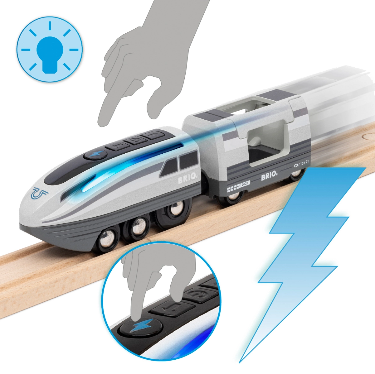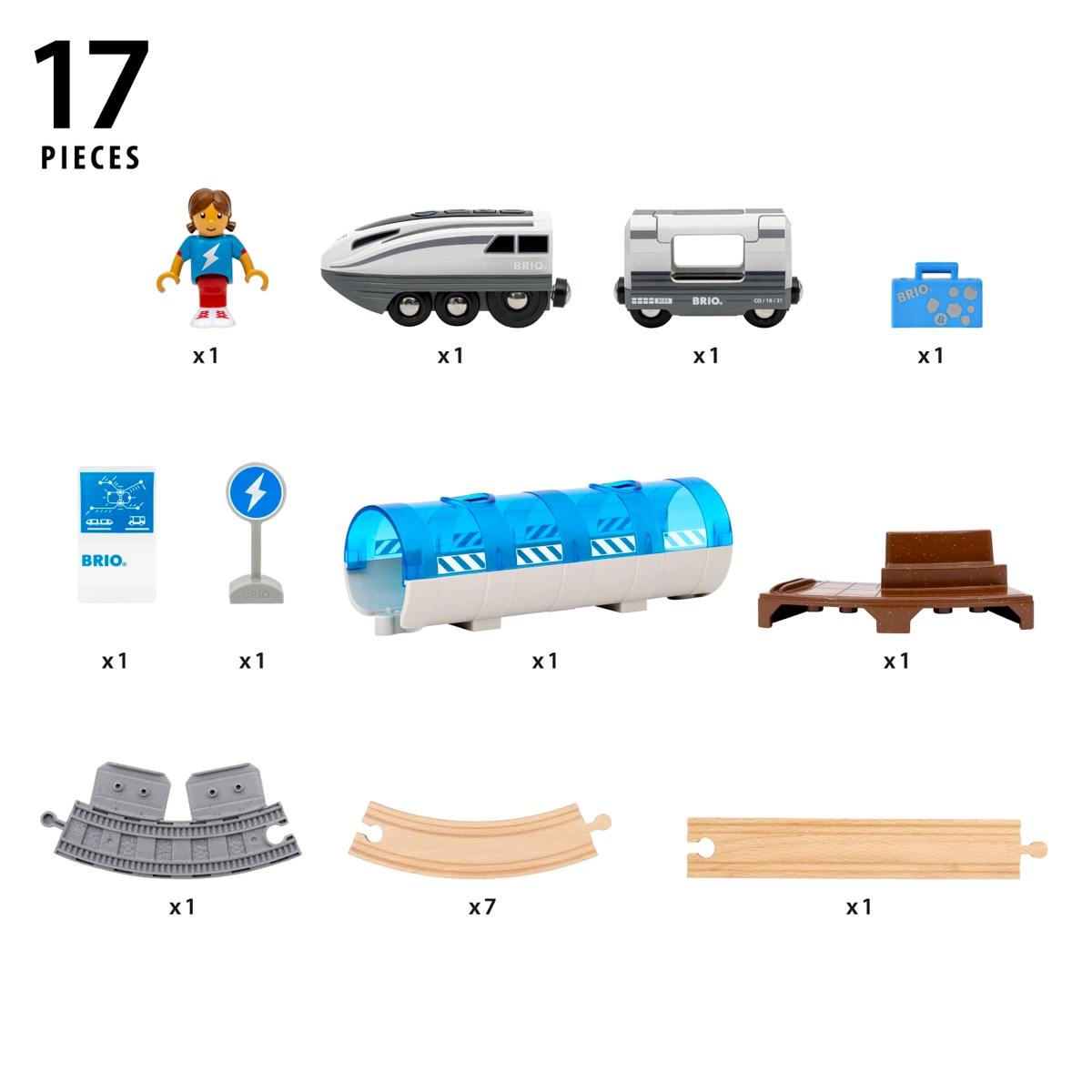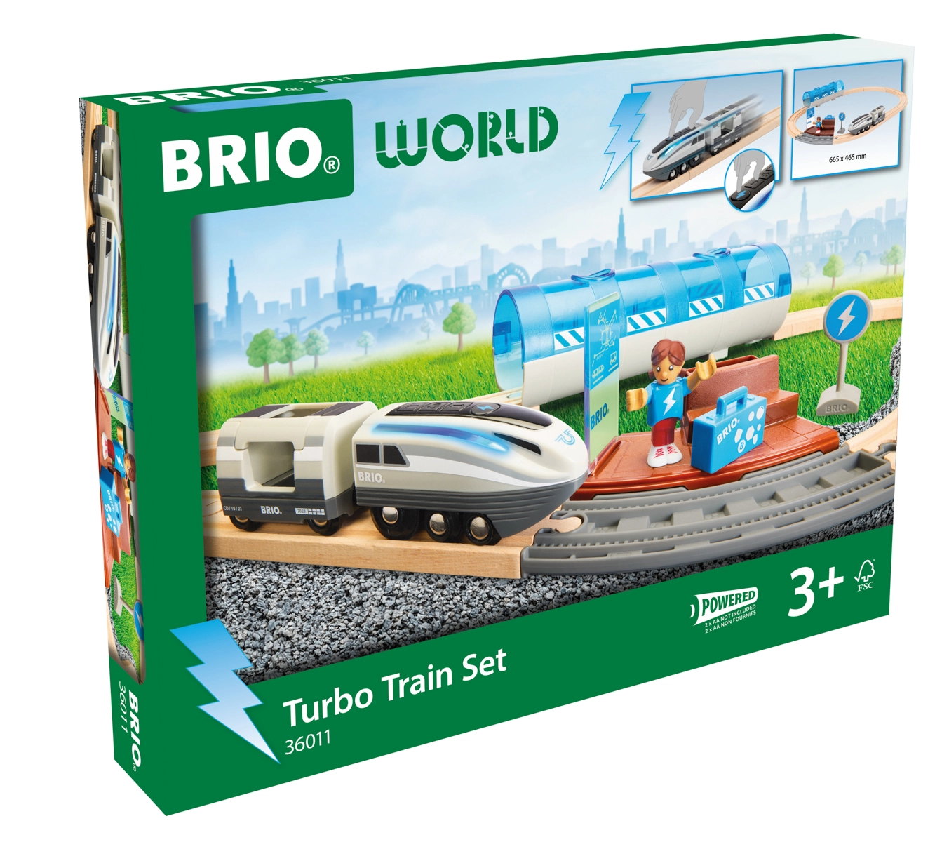 Questo set ferroviario creativo offre un divertimento dinamico: premendo il pulsante Turbo, la locomotiva a batteria diventa per 5 secondi il treno più veloce nel mondo BRIO e le sue luci laterali passano dal bianco a un blu freddo. Assembla il tracciato, attraversa il tunnel, fermati alla banchina e crea storie con passeggeri e accessori.