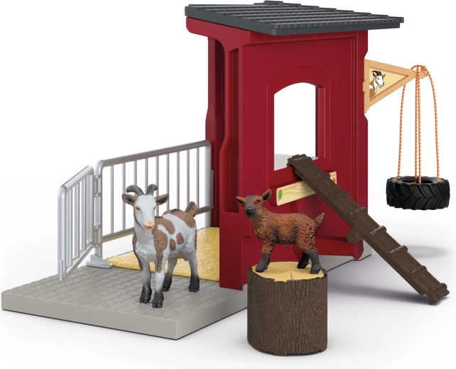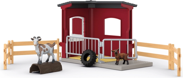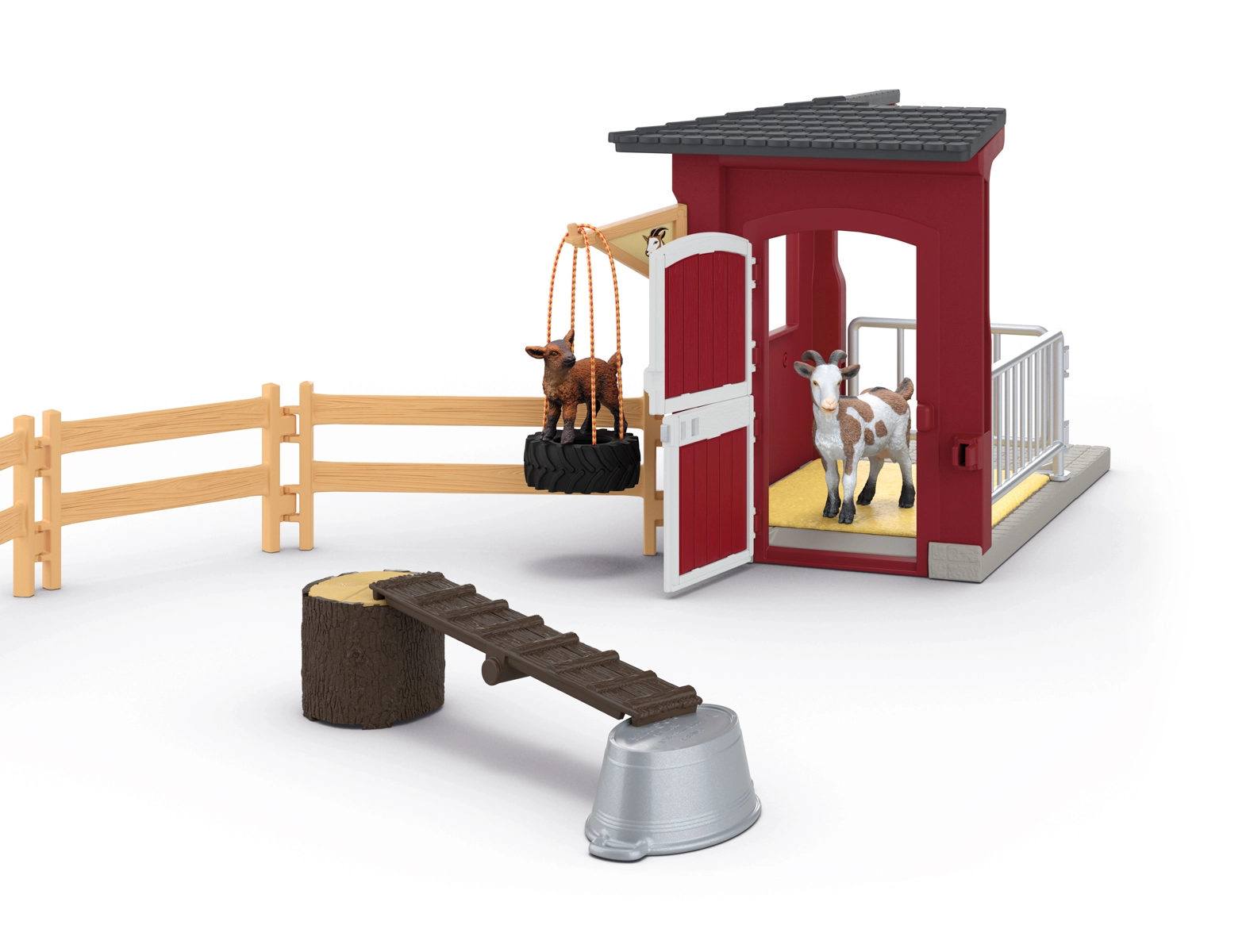 Nella splendida stalla rossa la capra e il capretto si sentono a casa. Il capretto può giocare sull’altalena con pneumatico o arrampicarsi sulla rampa, mentre la mamma sgranocchia verdure fresche. La sera li attende un ambiente accogliente con lettiera di paglia. I dettagli realistici e la qualità premium delle figure SCHLEICH entusiasmeranno ogni piccolo allevatore.