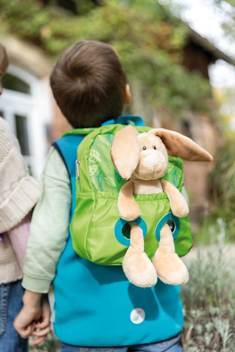 Il morbissimo coniglietto NICI è fissato nella tasca frontale con elastico: resta in posizione durante la camminata, ma si può estrarre in qualsiasi momento per coccole e gioco.