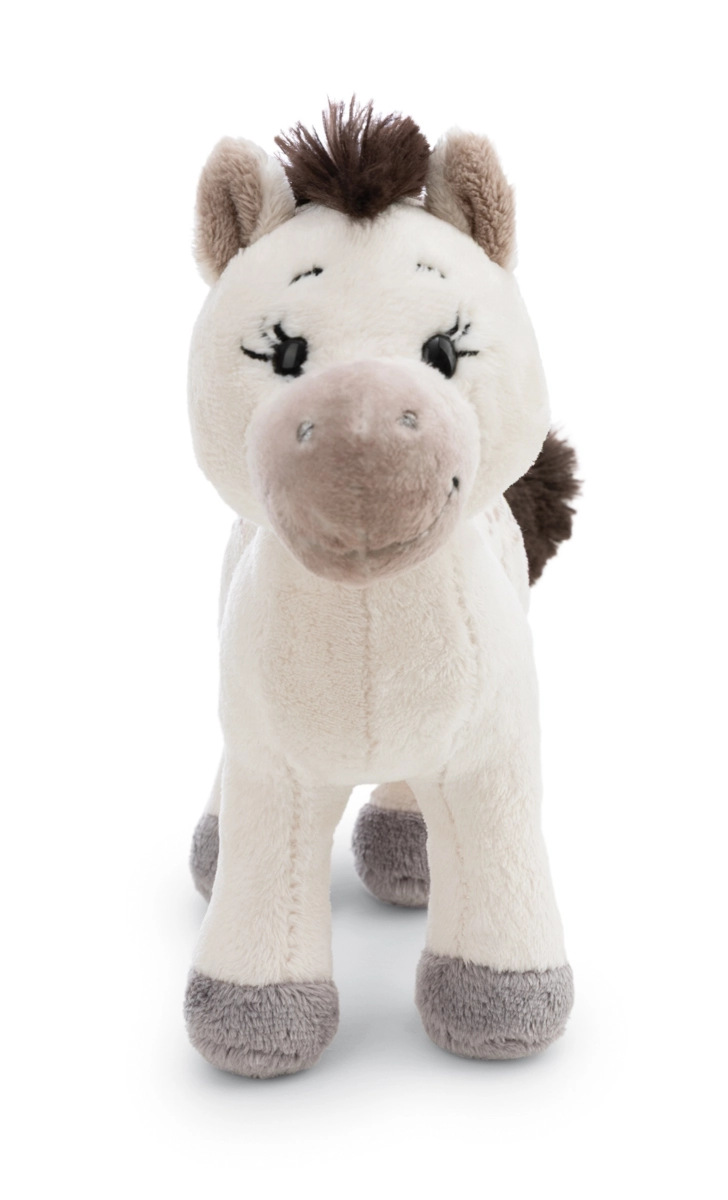 Il pony Mony incanta con il suo elegante manto bianco, la criniera e la coda marrone scuro e il delicato motivo maculato sulla groppa. Il design in posizione eretta e le cuciture di qualità garantiscono resistenza nell’uso quotidiano, mentre la superficie soffice invita a infinite coccole.