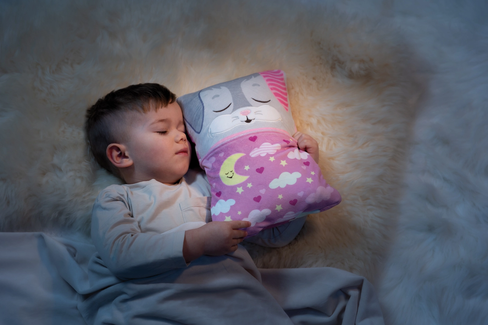 Con un solo gesto il coniglietto cambia colore ed espressione: di giorno stimola il gioco, la sera concilia il sonno.