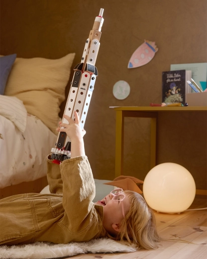 Da un unico set puoi creare un razzo, uno space shuttle, un aereo e tante altre idee personali. Pezzi perforati, viti e ingranaggi supportano esperimenti creativi.