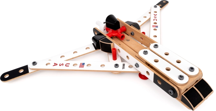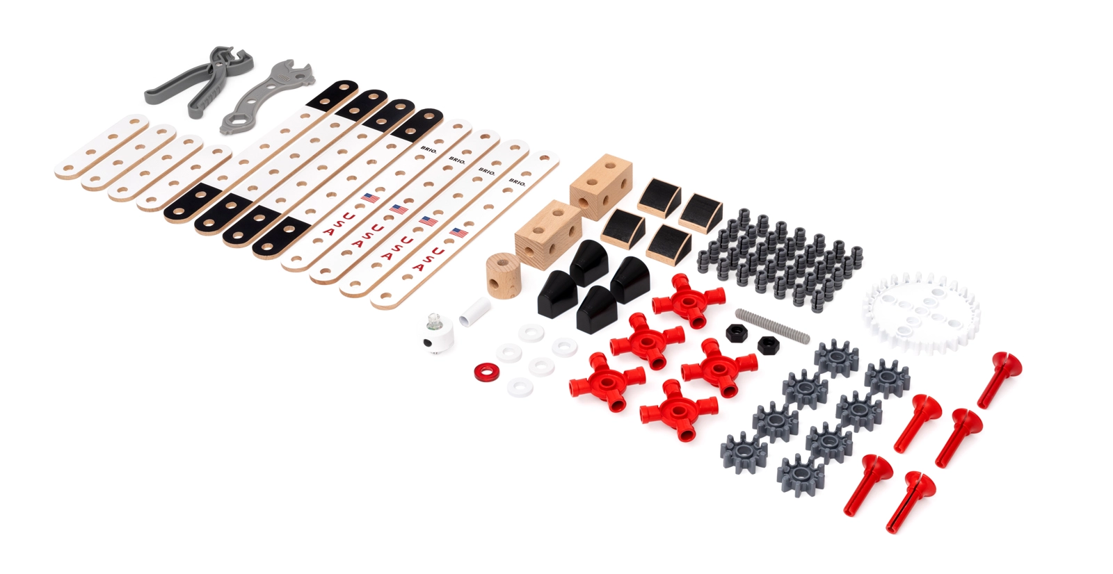 Profili e blocchi in legno robusti combinati con connettori, dadi e utensili in plastica garantiscono solidità dei modelli e facile montaggio.