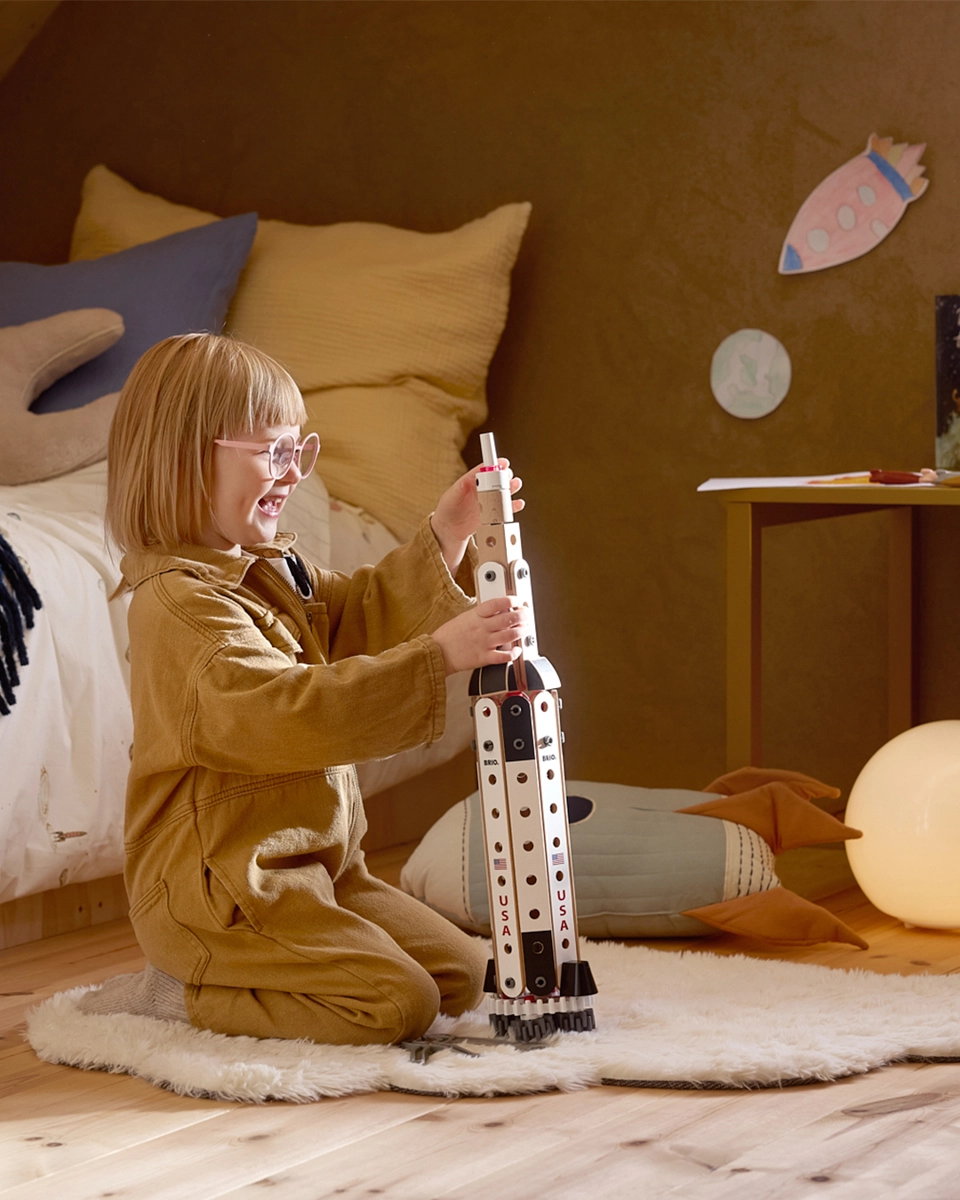 Scopri l’iconico razzo NASA Apollo Saturn V nella versione del set di qualità BRIO Builder. La robusta combinazione di profili e blocchi in legno con connettori, ingranaggi e utensili in plastica favorisce il gioco libero, gli esperimenti tecnici e la fantasia. La configurazione a tre stadi con punta lampeggiante immerge i bambini nel mondo dell’astronautica e dei racconti sulla conquista dello spazio.