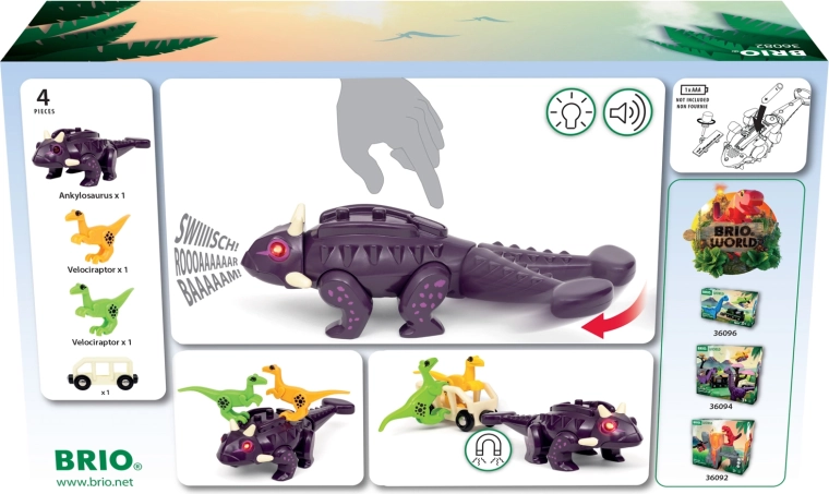Scopri un'avventura ricca di azione con BRIO World – Il mondo dei dinosauri. Il possente anchilosauro con occhi rossi luminosi, ruggito attivato dal movimento e coda a molla abbatte facilmente gli ostacoli e traina i vagoncini grazie al magnete nella coda. Un accessorio ideale per le piste ferroviarie in legno BRIO e un fantastico gioco per bambini dai 3 anni in su.