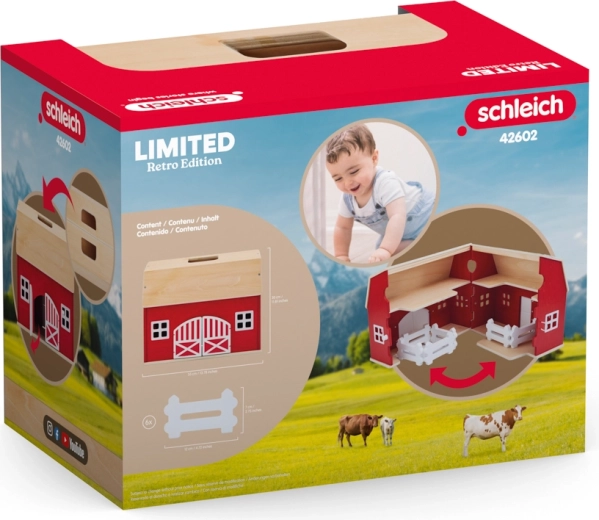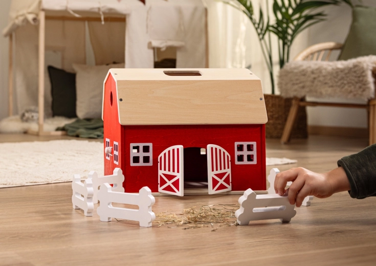 Grazie alla maniglia integrata la fattoria è ideale anche in viaggio. Dettagli studiati, come i grandi portoni e il tetto alto, stimolano la fantasia e lo sviluppo della motricità fine. Il complemento perfetto per le figure e gli accessori SCHLEICH: basta preparare il recinto e gli animali possono trasferirsi!