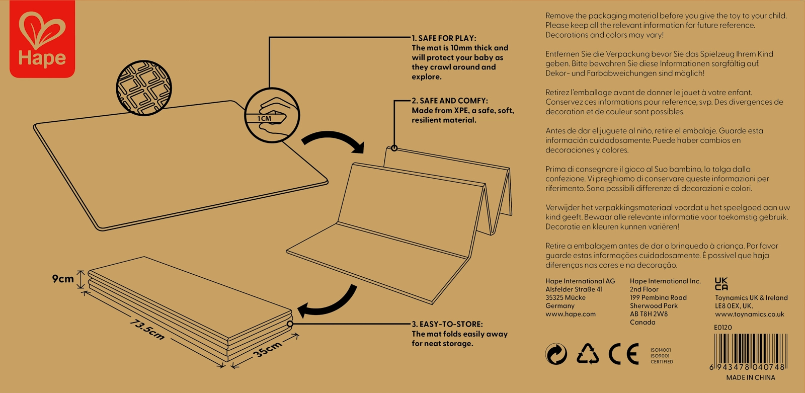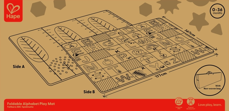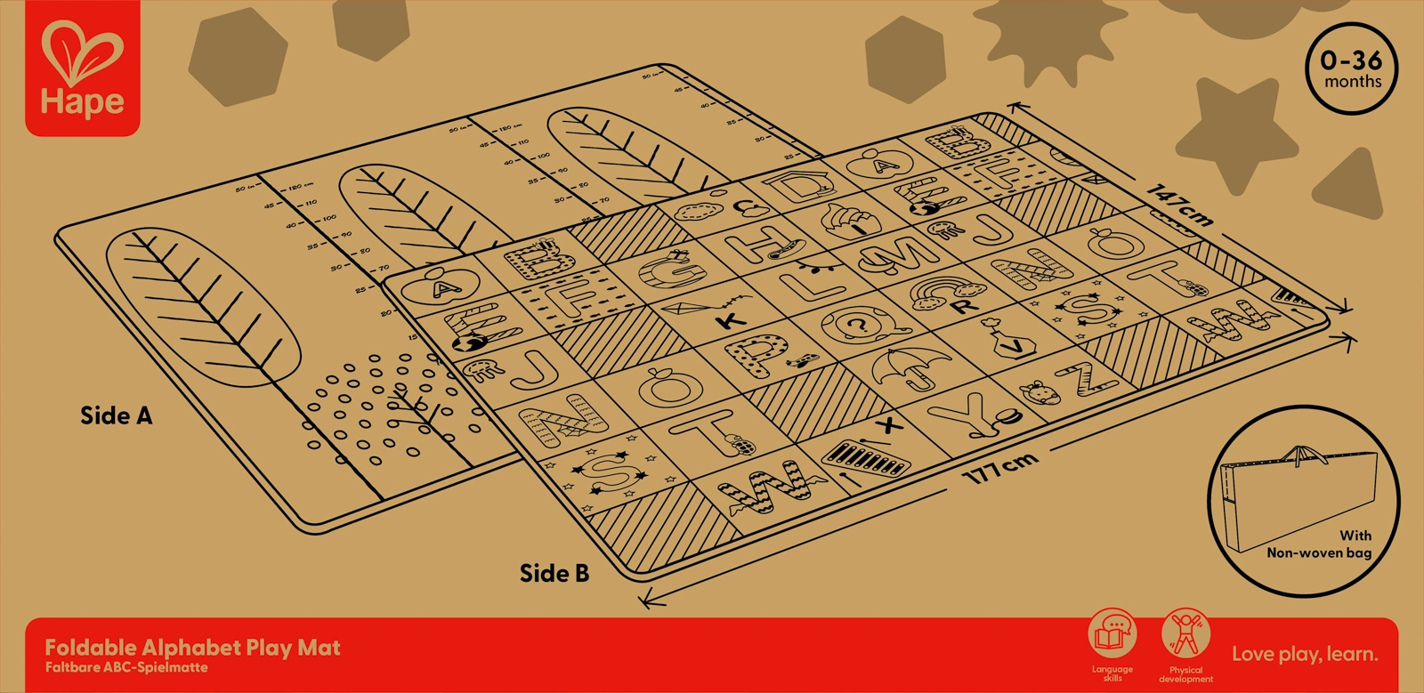 Questo tappetino pieghevole HAPE offre ai bambini un luogo sicuro e confortevole per le prime esplorazioni del mondo. Le generose dimensioni 147 × 177 × 1 cm garantiscono ampio spazio per giocare, mentre il design bifacciale combina un'alfabeto educativo con una pratica scala di altezza per seguire la crescita in modo divertente.