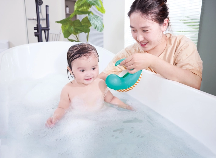 Il gioco con l’acqua favorisce lo sviluppo della motricità fine, la coordinazione occhio–mano e l’apprendimento del principio causa–effetto. I bambini possono mirare ai bersagli, sciacquare la schiuma dalla pelle o semplicemente osservare il flusso dell’acqua. L’annaffiatoio è leggero, galleggia e, grazie ai bordi lisci e arrotondati, è sicuro per i rituali quotidiani del bagnetto.