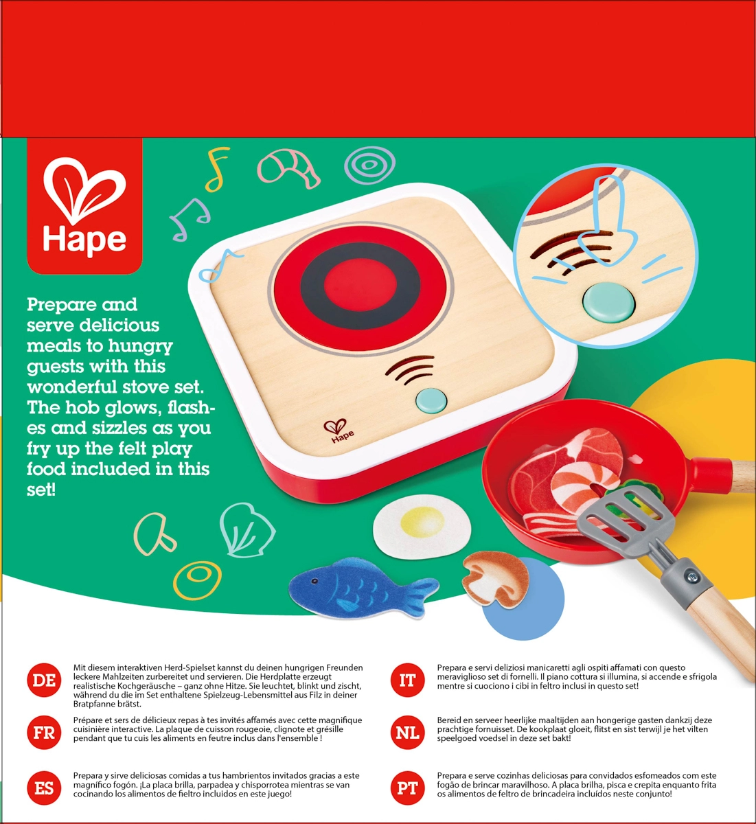 Regala ai bambini un’esperienza di cucina realistica con il resistente piano cottura in legno Hape. Con una sola pressione del pulsante si attivano luce lampeggiante e sibilo autentico, ricreando l’atmosfera di una vera cucina. Il set è ideale per il gioco autonomo o per cucinare insieme ai genitori.