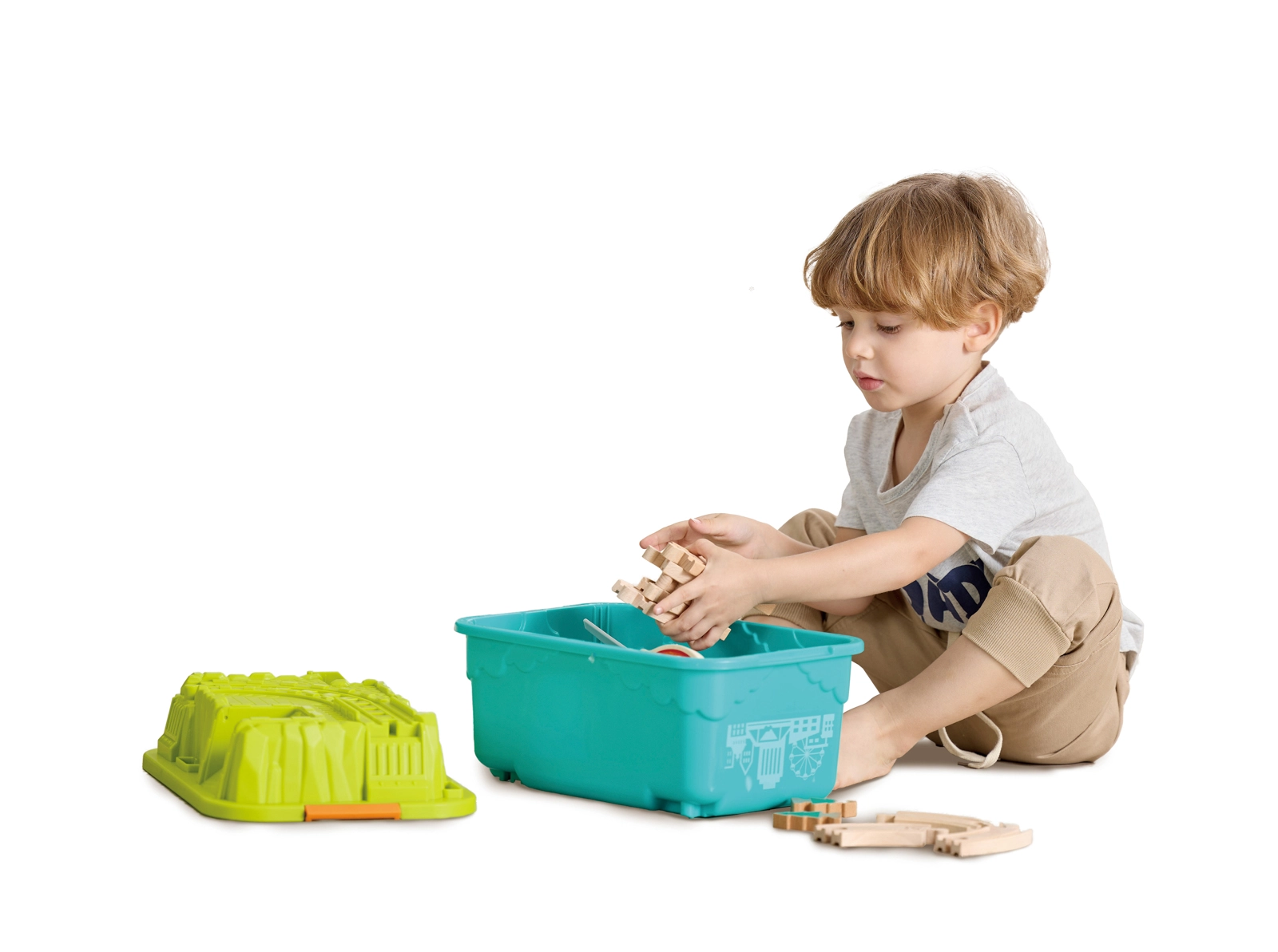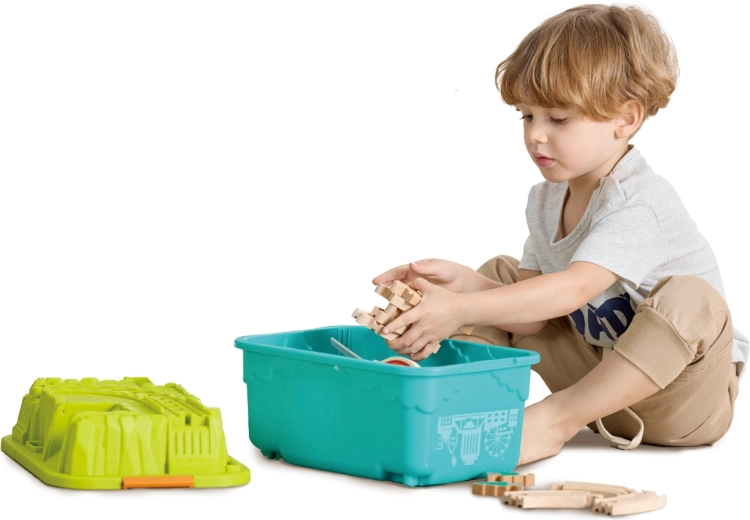 Dopo il gioco, tutti i pezzi si ripongono facilmente nel pratico box. Il suo coperchio, capovolto, si trasforma in una base di terreno, rendendo riordino e nuove costruzioni un gioco da ragazzi. I binari sono compatibili con HAPE e BRIO, quindi puoi ampliare il set liberamente.