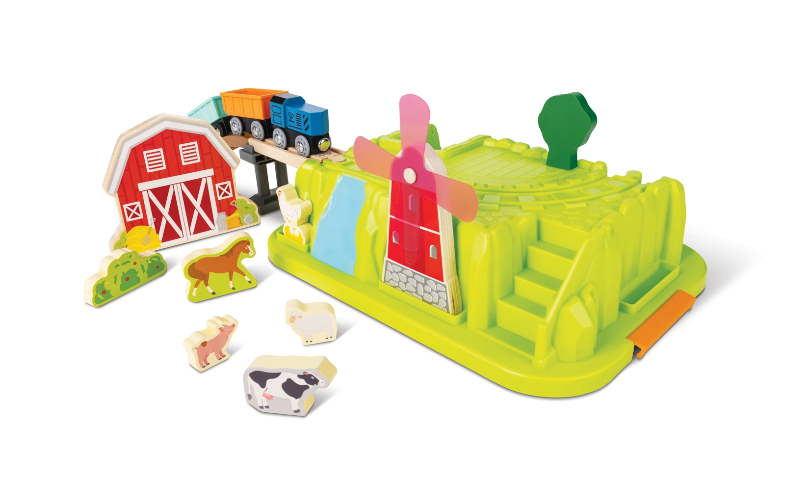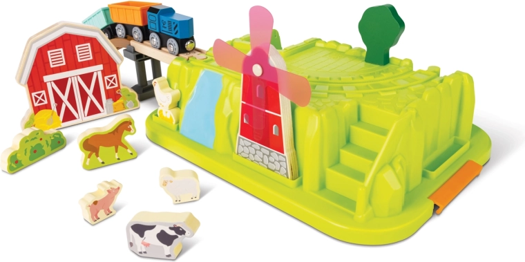 Locomotiva, vagoni, fienile, ponte, mulino a vento girevole e set di animaletti creano un ricco scenario per il gioco libero e storie di campagna.