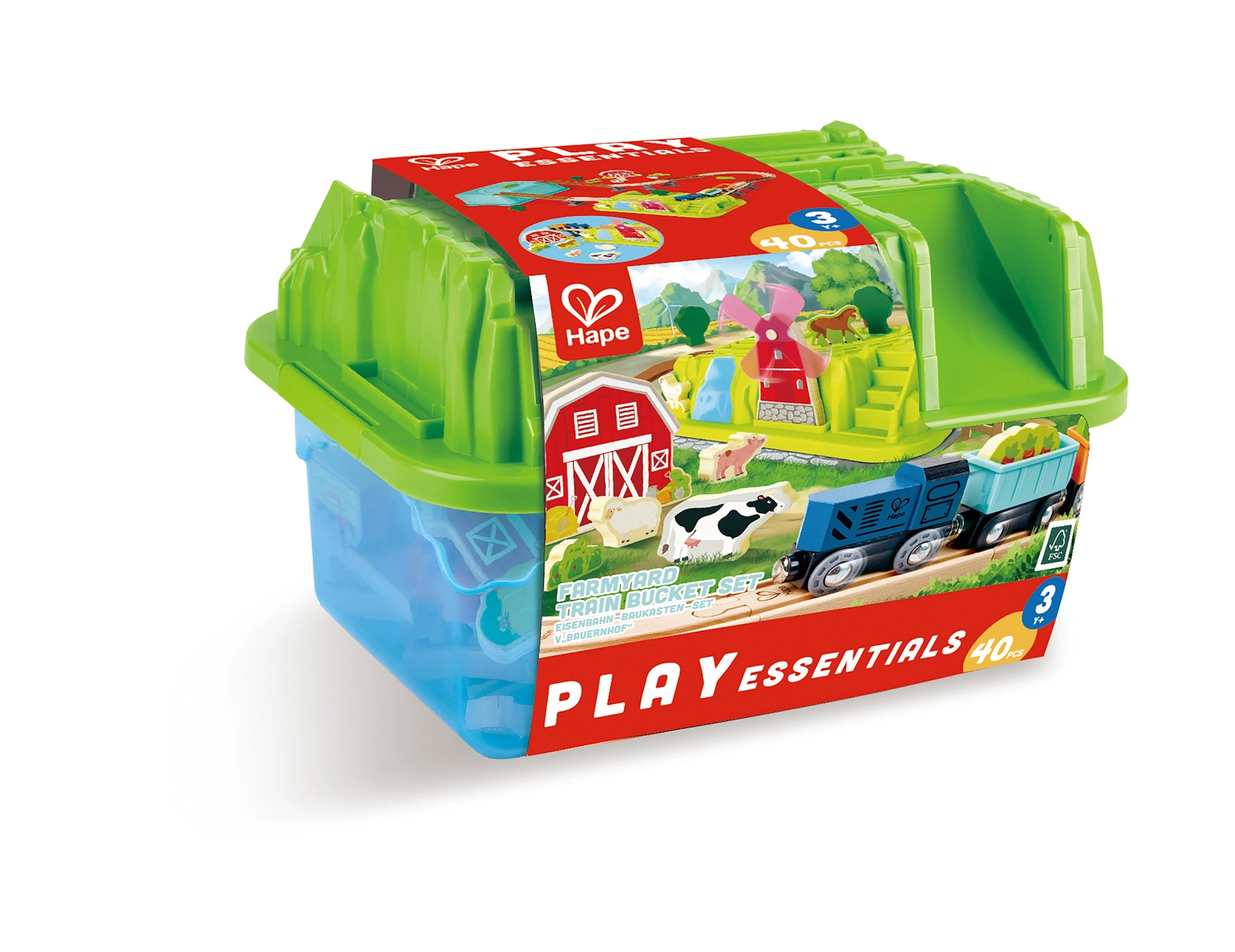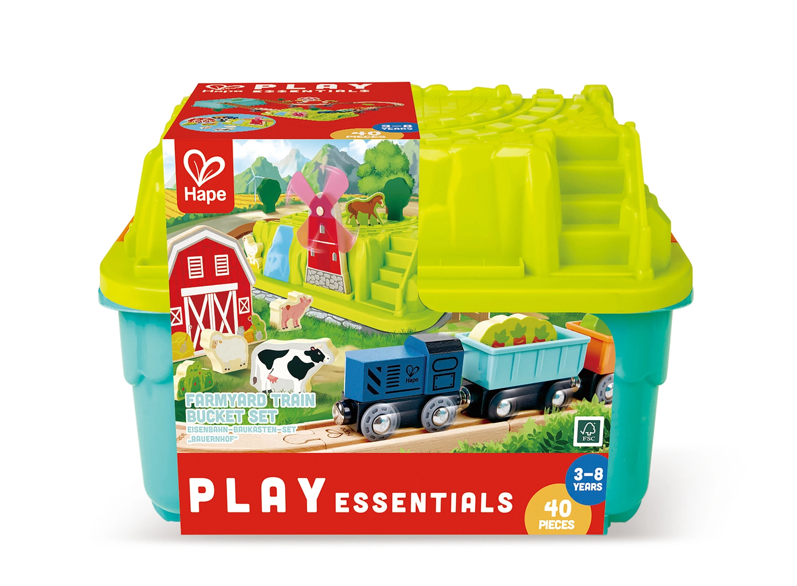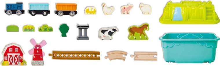 - Contenuto del set: locomotiva, 2 vagoni, binari in legno, fienile, ponte/ponticelli, mulino a vento, animaletti (maialino, mucca, cavallo, pecora, gallina con uova), alberelli e accessori – in totale 40 pezzi