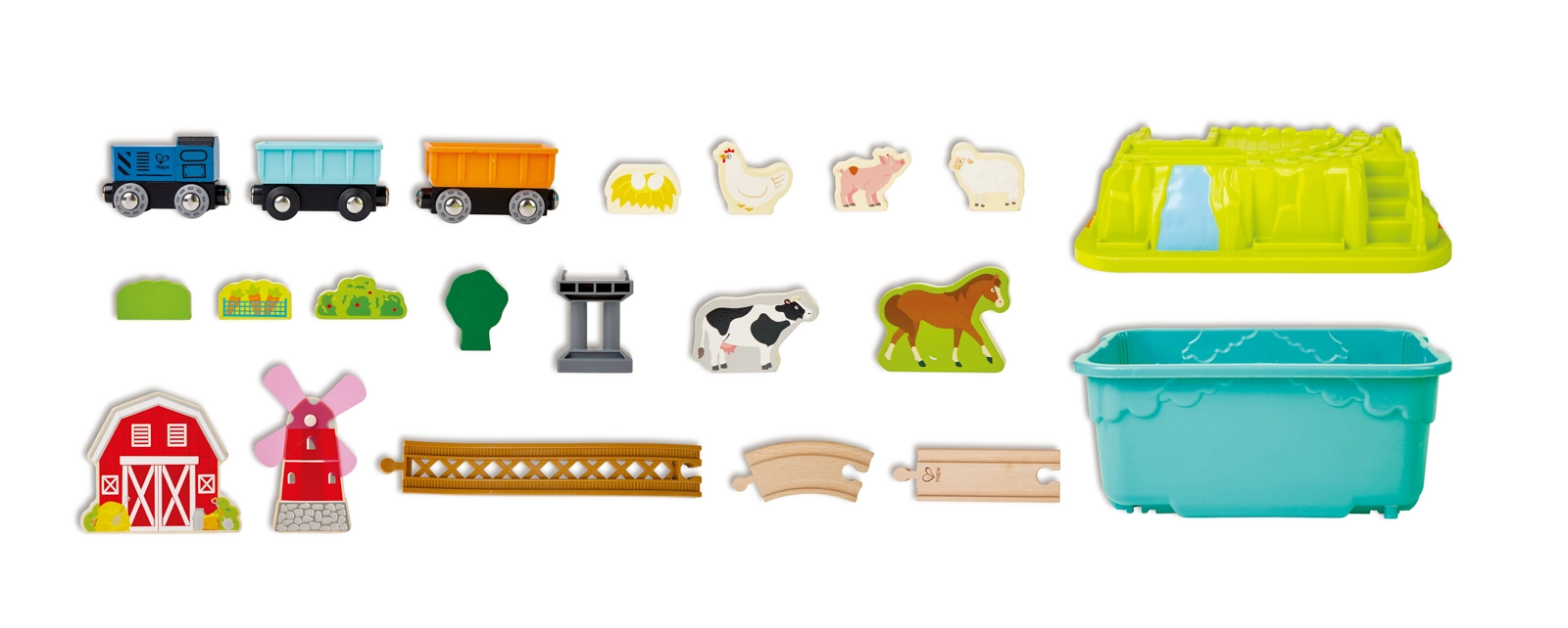 - Locomotiva, vagoni merci, binari, ponte/ponticelli, fienile, mulino a vento, animaletti (maialino, mucca, cavallo, pecora, gallina con uova), accessori