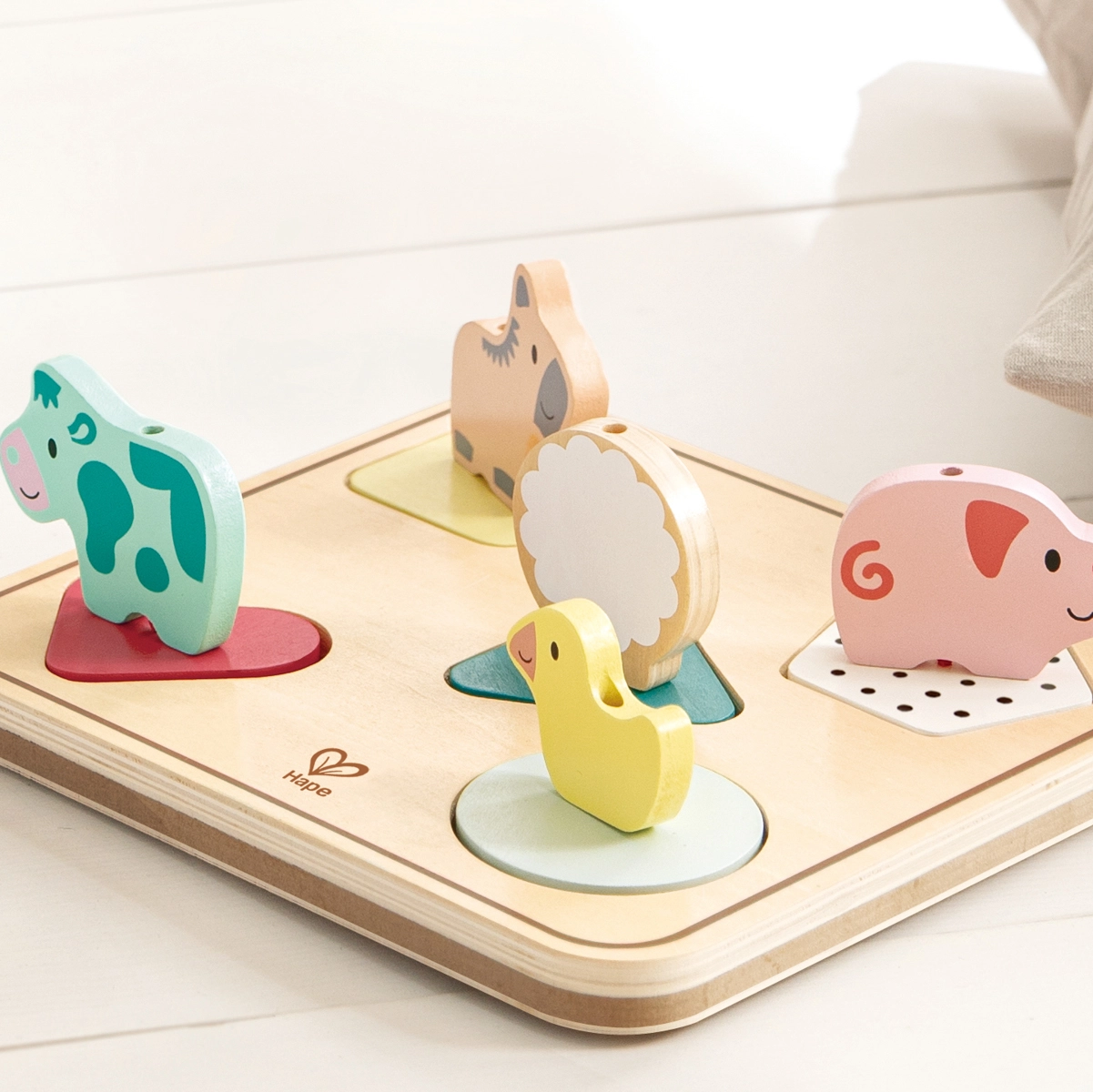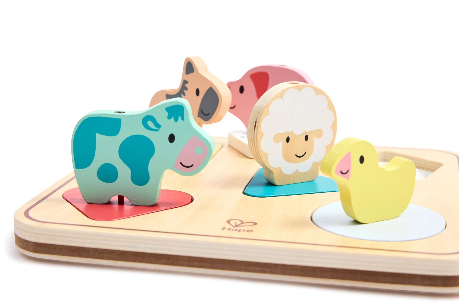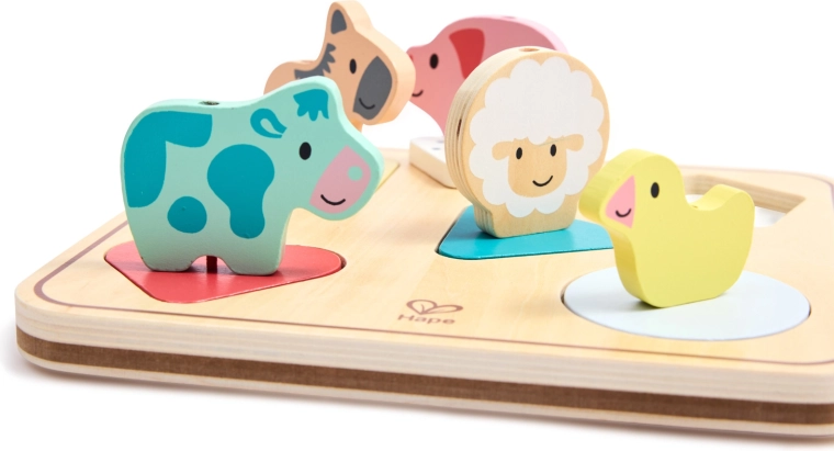 Regala ai bambini i primi incastri logici che divertono e insegnano. Questo puzzle in legno con cinque animali della fattoria di HAPE riproduce i loro suoni caratteristici quando il pezzo è inserito correttamente. Grazie ai pezzi robusti, facili da afferrare, e agli incavi ben visibili, le piccole mani trovano facilmente il posto giusto.