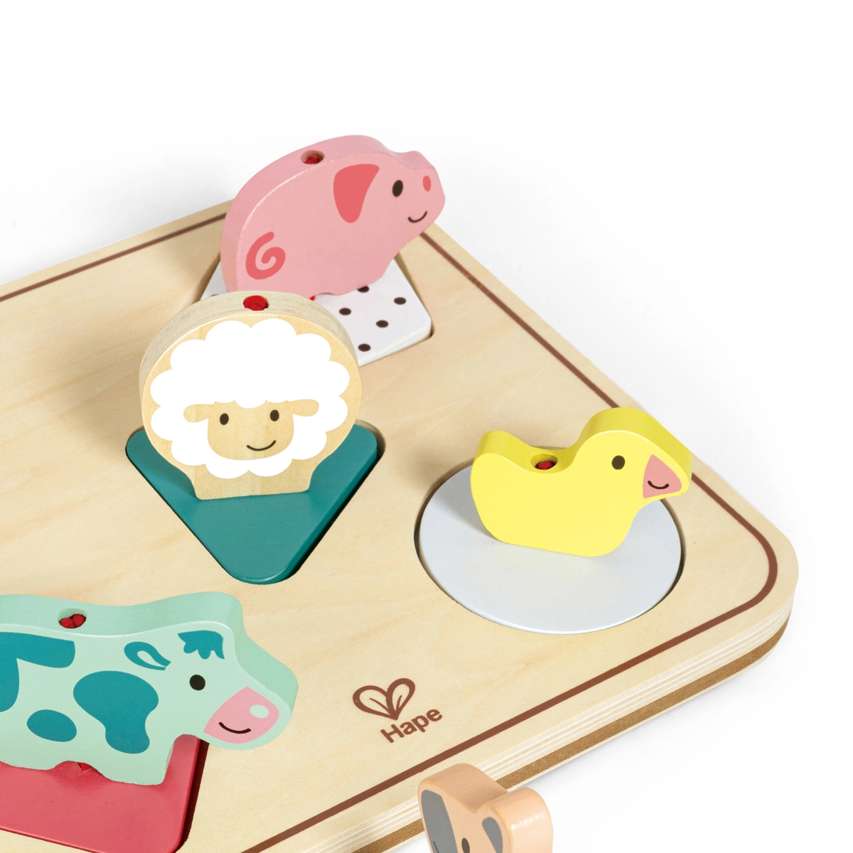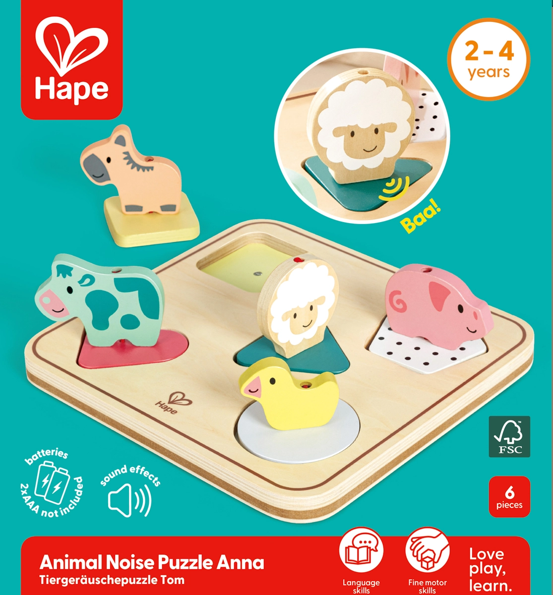 Scopri i divertenti puzzle in legno con suoni di HAPE, che aiutano i bambini a riconoscere animali da fattoria, colori e forme. Quando il pezzo è posizionato correttamente, riproduce un autentico verso dell’animale, favorendo motricità fine, coordinazione e il piacere di imparare giocando. Realizzato in resistente legno FSC con colori sicuri. Adatto dai 2 anni.