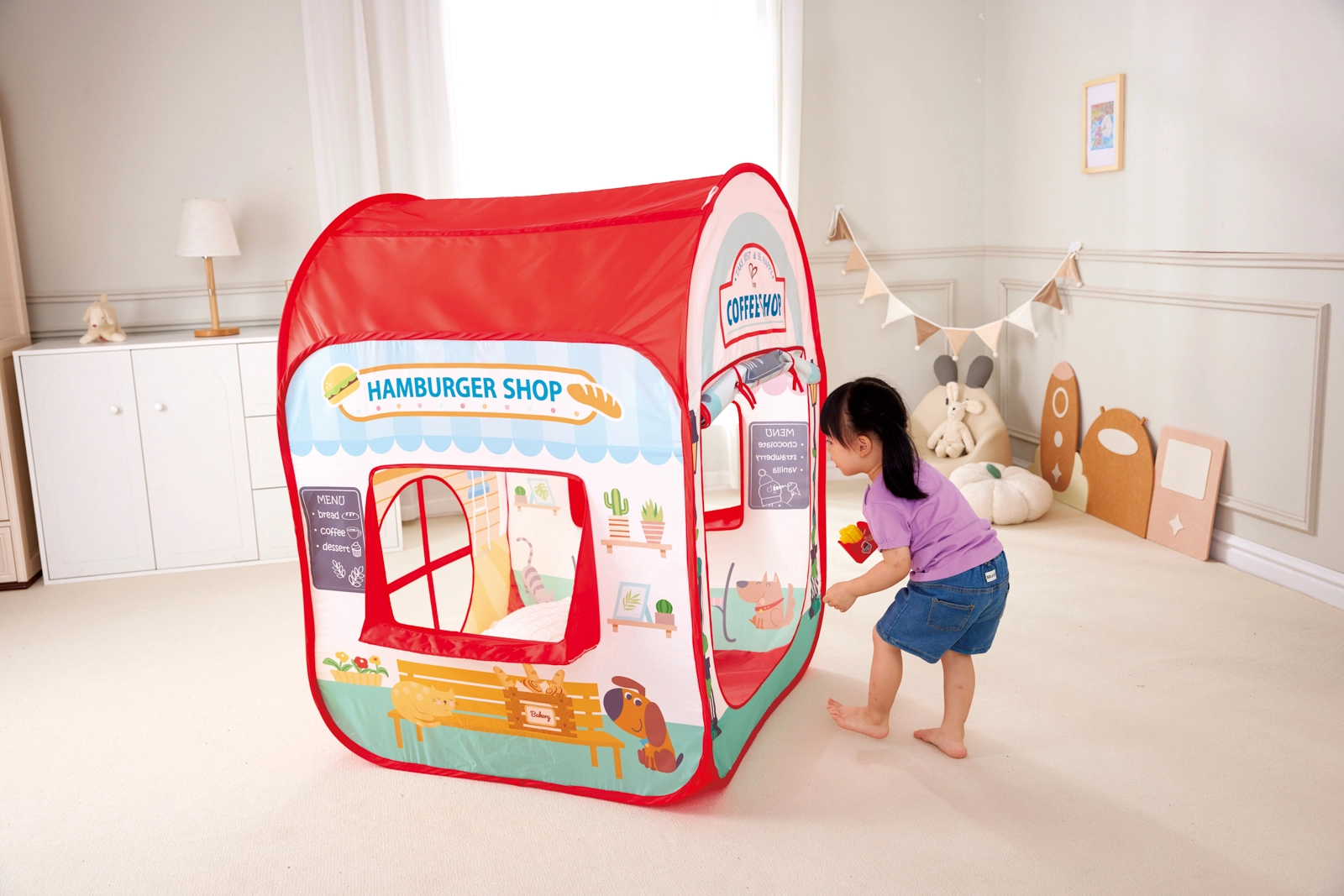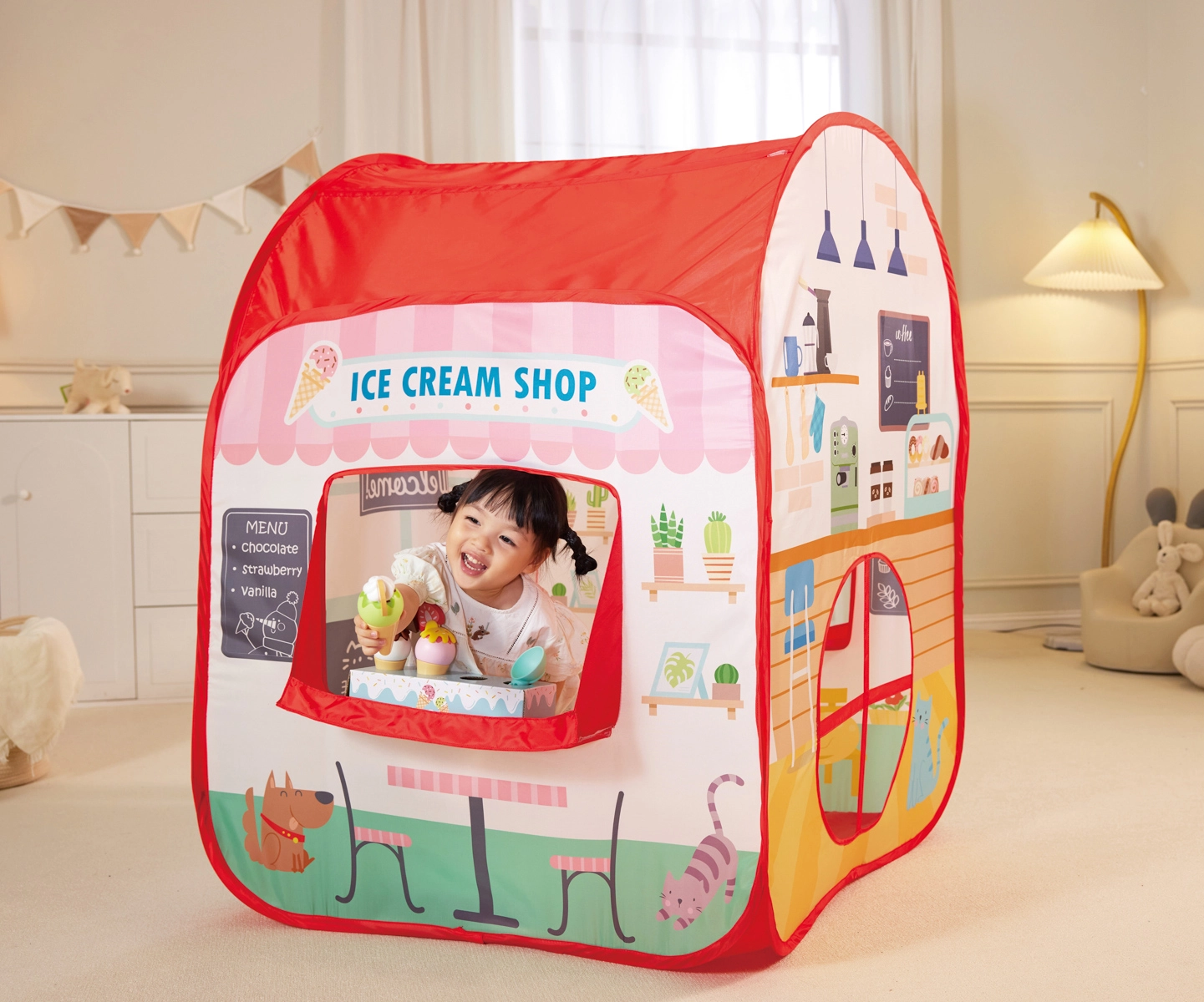 Tenda pieghevole per bambini – gelateria, burger shop e caffetteria per un gioco fantasioso e di ruolo. Design pop-up leggero, materiali resistenti e ricchi accessori (gelati, hamburger, patatine, cola, cucchiaio) offrono ai bambini spazio per la creatività. Facile da montare, colori vivaci e grafica dettagliata perfetti a casa e all’asilo. Età 3+.