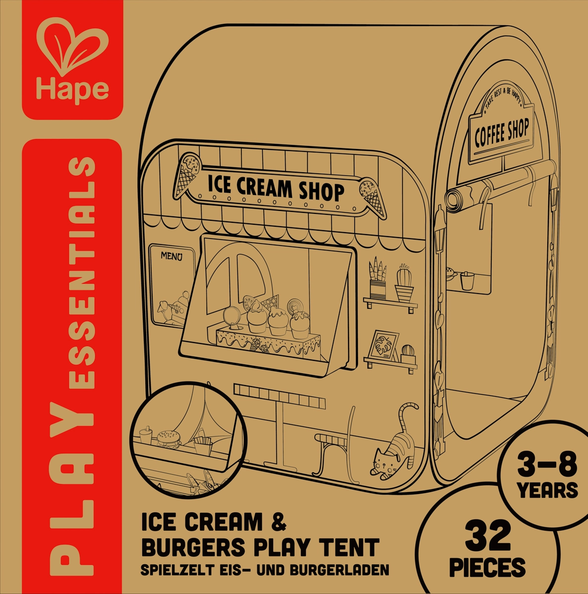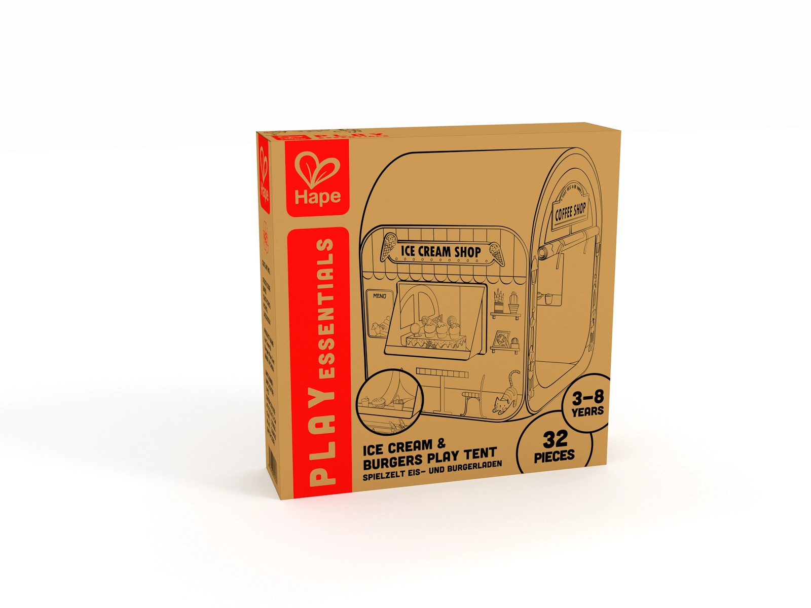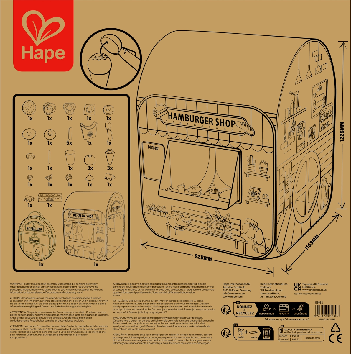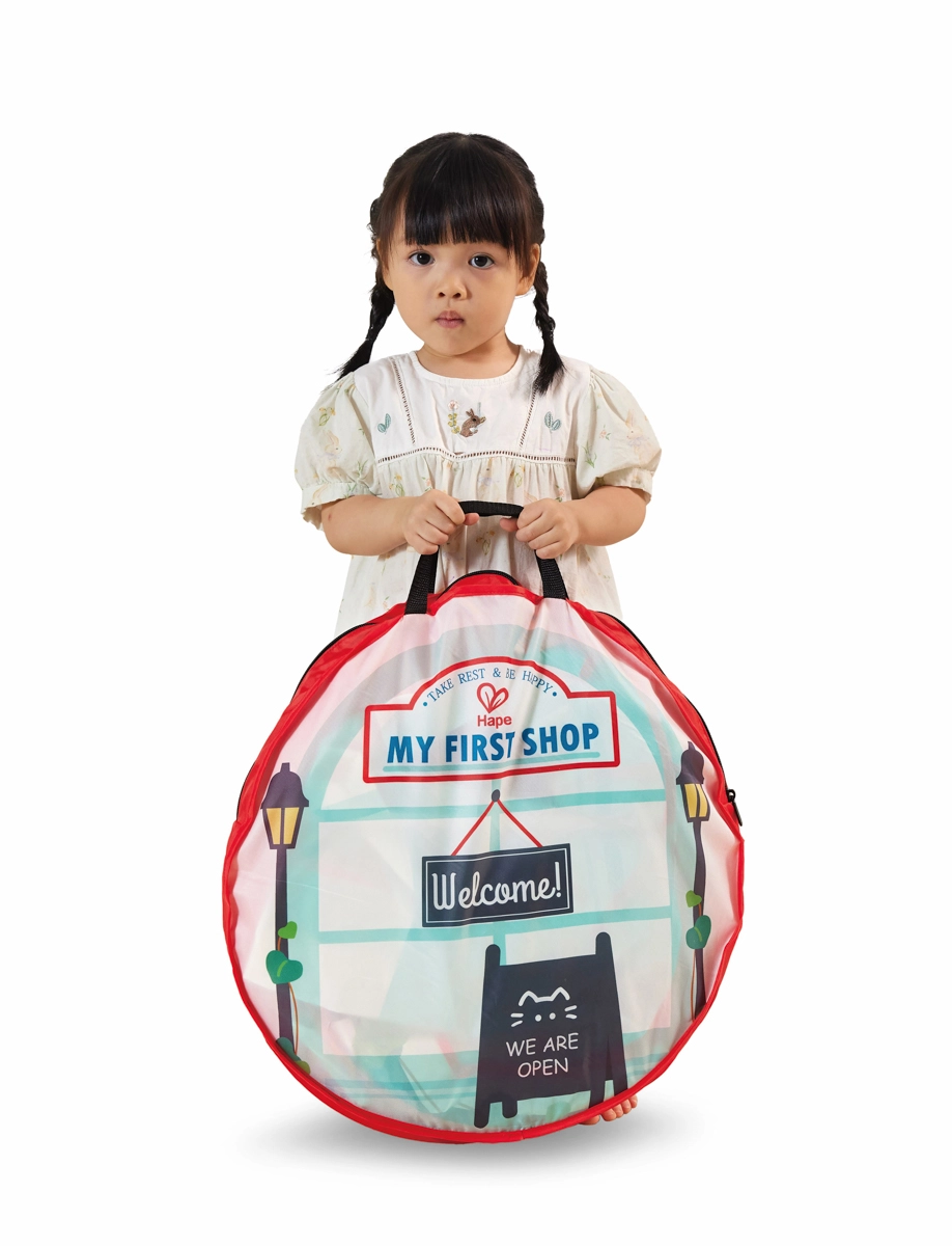 Trasformate la cameretta in una vivace strada del gusto! Questa elegante tenda-negozio “My First Shop” unisce gelateria, burger shop e caffetteria in un unico set. Grazie alle stampe realistiche, alla finestra di servizio e alla porticina d’ingresso, i bambini vivranno un’autentica esperienza di servizio ai clienti e ricchi scenari di gioco.