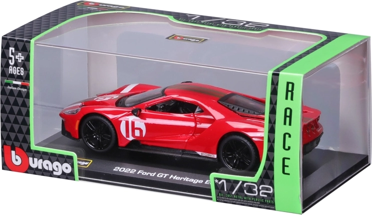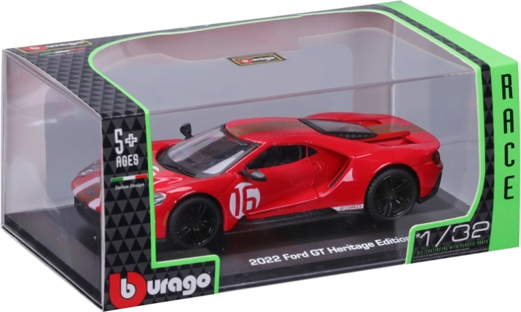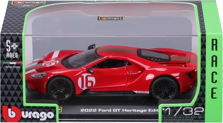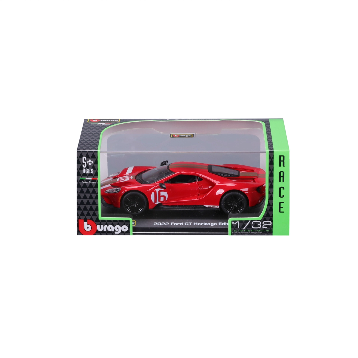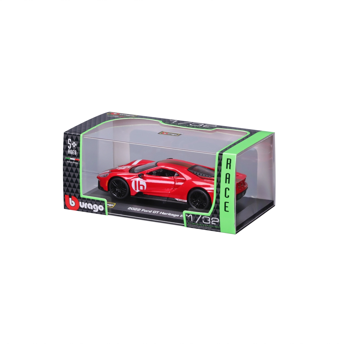 Modello in metallo dell'auto 2022 FORD GT Heritage Edition in scala 1:32 del marchio Bburago della collezione Race, perfetto per collezionisti e bambini dai 3 anni. Offre dettagli precisi, parti apribili e un classico design da corsa con il numero 16 per un'esperienza autentica sia in gioco che in esposizione.
