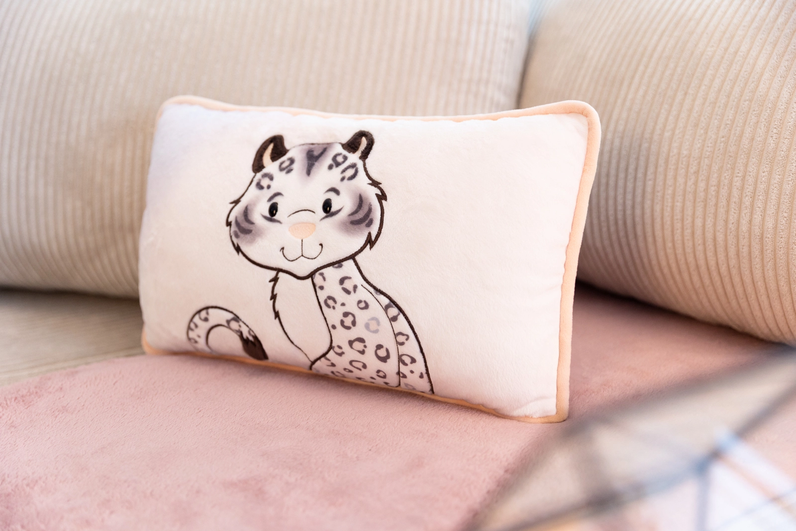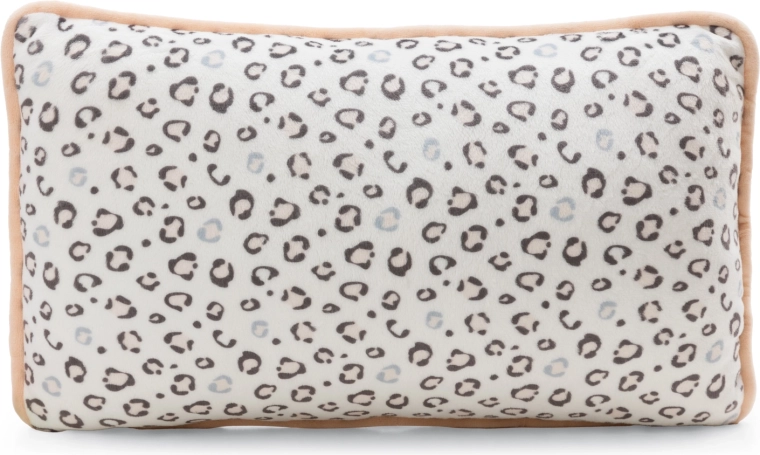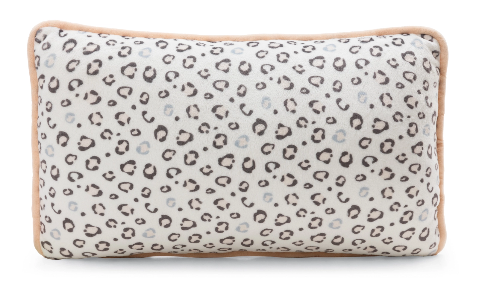 Il lato anteriore è impreziosito da una tenera applicazione del leopardo delle nevi, il lato posteriore presenta un elegante motivo leopardato – ideale sia per decorare sia per rilassarsi.