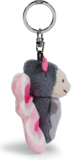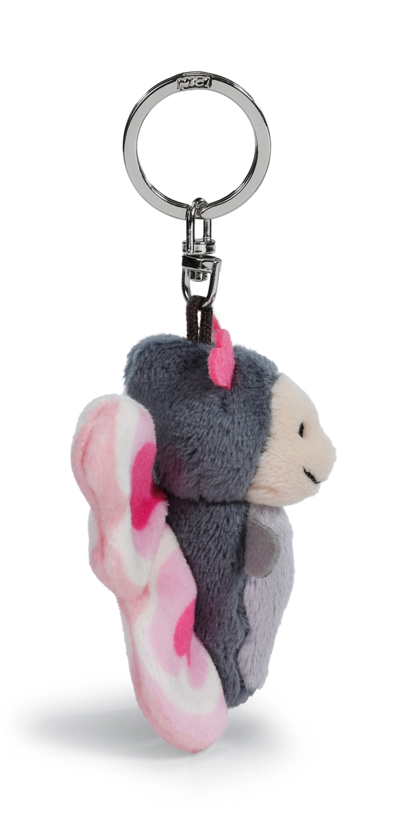 Il corpicino grigio morbido, le ali rosa e i dettagli a cuore catturano subito l’attenzione e donano a chiavi o zaino un tocco personale.