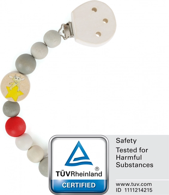 L'elegante e sicuro clip in legno per ciuccio small foot Ludwig mantiene il ciuccio sempre a portata di mano e pulito. È resistente alla saliva, piacevole al tatto e le sue diverse forme e perline favoriscono lo sviluppo della motricità fine e stimolano la curiosità dei più piccoli. Realizzato in legno di alta qualità privo di sostanze tossiche.
