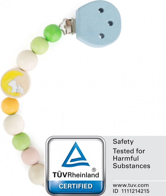 Realizzato in legno di qualità con superficie liscia e colori sicuri privi di sostanze tossiche. La resistenza alla saliva e la struttura robusta garantiscono una lunga durata. Il laccetto universale si adatta alla maggior parte dei ciucci con anello.