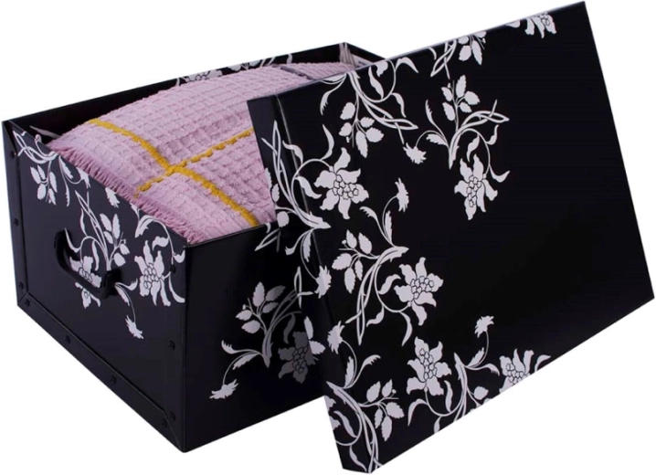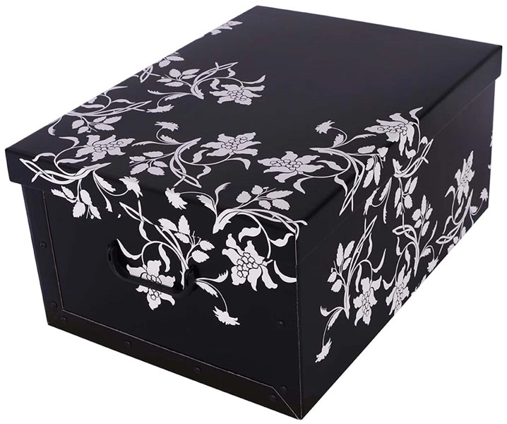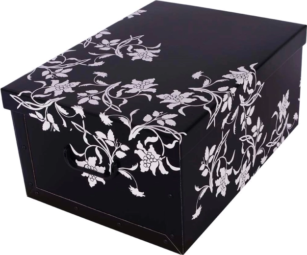 Il decoro nero con fiori bianchi dona eleganza a qualsiasi ambiente; la scatola è adatta sia per l’armadio sia per gli scaffali.