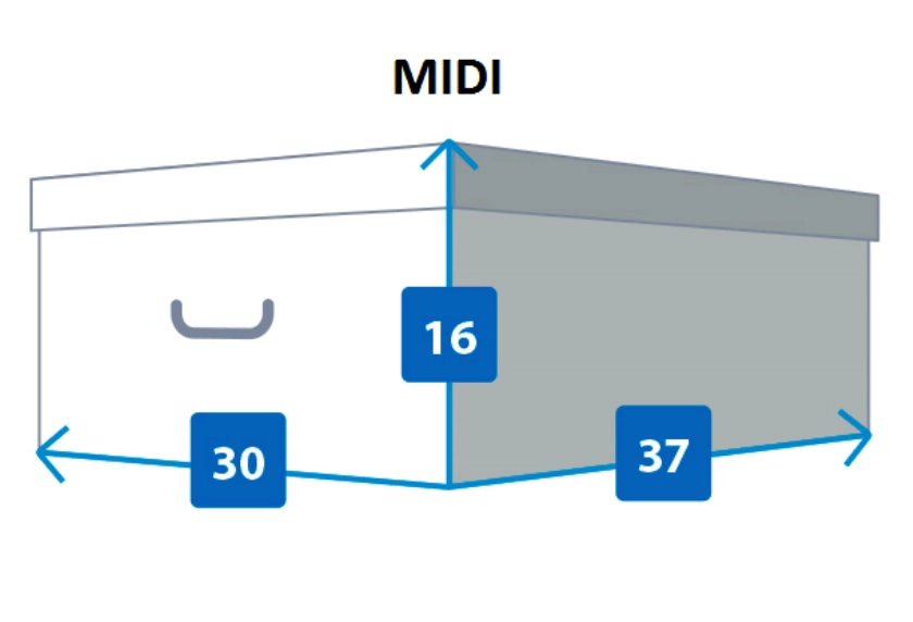 Questa scatola misura MIDI unisce un aspetto accattivante ad alta resistenza. È realizzata in cartone accoppiato riciclato al 100% con angoli rinforzati e bordi superiori doppi per una lunga durata. Le pareti laterali sono fissate con rivetti in plastica e sui lati trovi pratiche maniglie per un trasporto agevole. Il coperchio è fornito già montato, per un’installazione rapida e intuitiva.