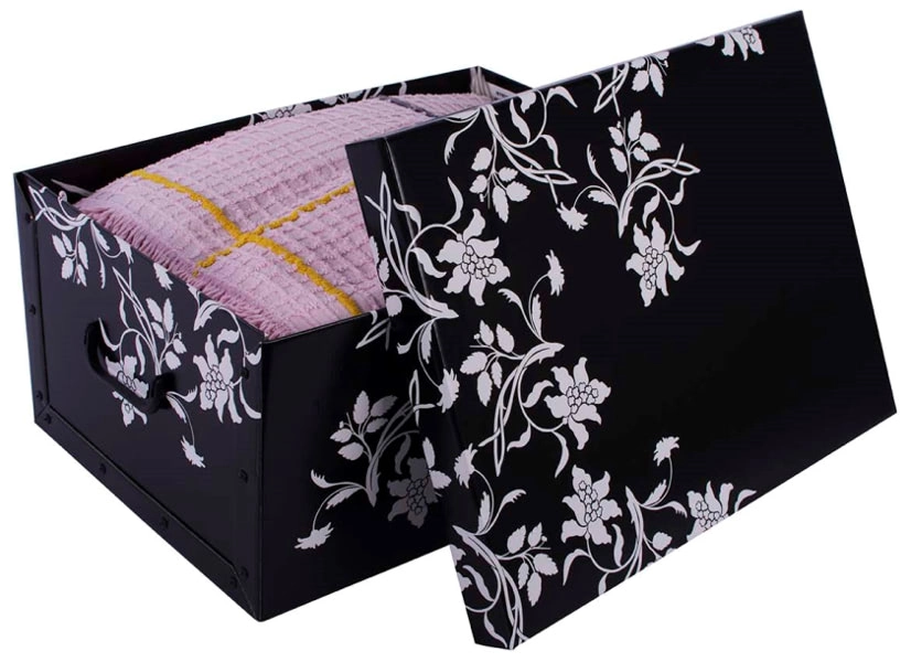 La scatola nera con disegno floreale bianco dona estetica e ordine a scaffali e guardaroba, nascondendo al contempo il contenuto dalla polvere grazie al coperchio robusto.