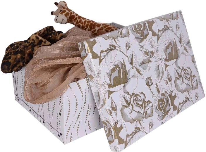 Scoprite la pratica e al tempo stesso decorativa scatola portaoggetti MAXI con motivo di rose dorate, che aggiunge al vostro interno un tocco lussuoso ma discreto. Grazie al cartone 100% riciclato e all'alta qualità della produzione italiana, è un’ottima scelta per l'uso quotidiano e per lo stoccaggio a lungo termine.