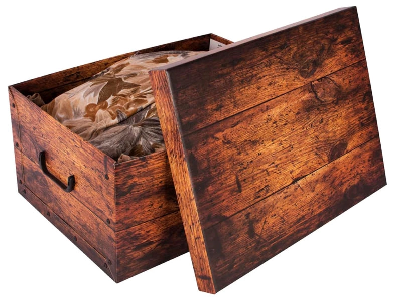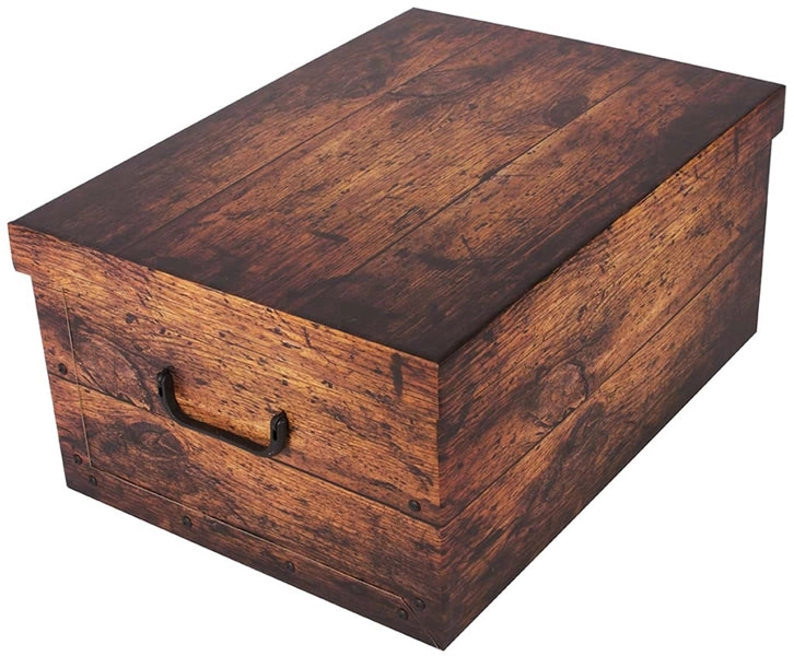Elegante scatola portaoggetti con decorazione in legno rustico in cartone rigido accoppiato, realizzato con materiali 100% riciclati. Grazie alla superficie lavabile è facile da mantenere, presenta pareti laterali robuste unite da rivetti, bordi superiori doppi e comode maniglie per un trasporto agevole. Montaggio semplice e veloce, il coperchio è pronto all’uso. Prodotto in Italia.