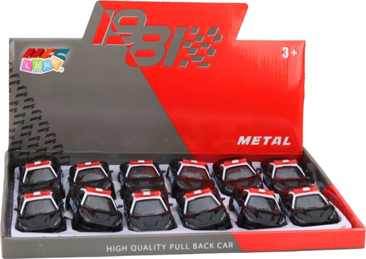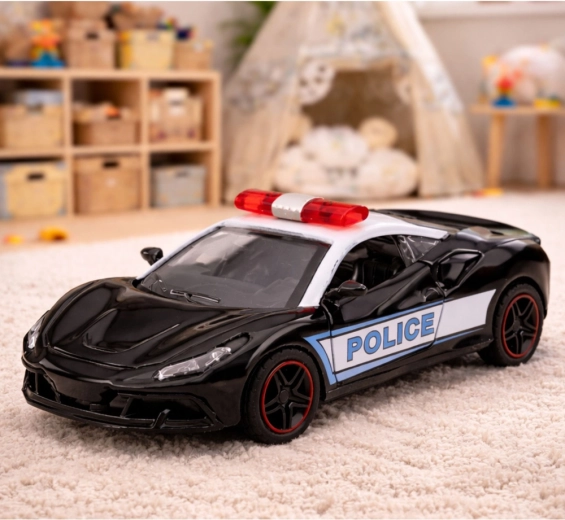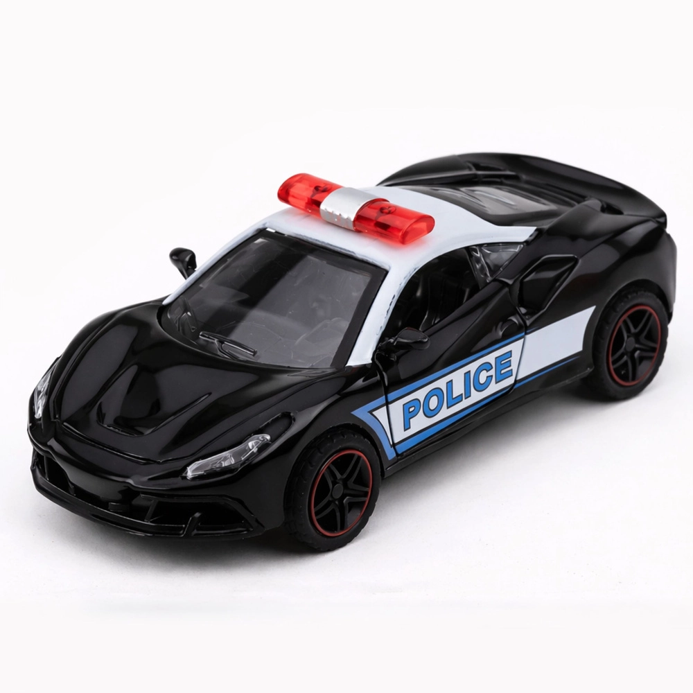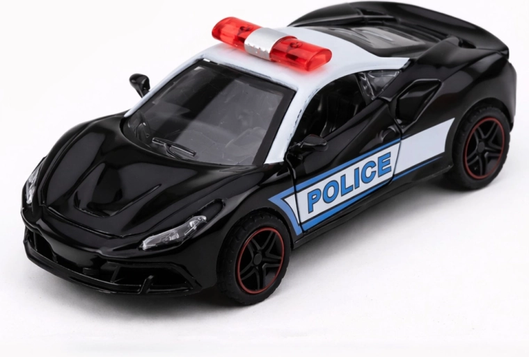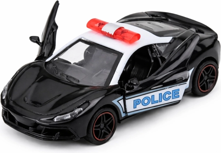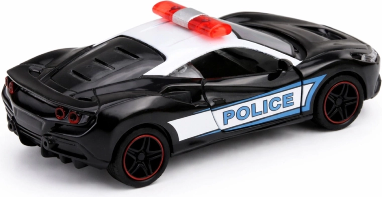Modello sportivo della polizia in colorazione bianco e nero con scritte POLICE ben visibili e barra luminosa sul tetto: colpisce per il design moderno e la qualità costruttiva. La carrozzeria in metallo combinata con plastica resistente prolunga la durata del giocattolo e ne aumenta la stabilità durante la corsa.