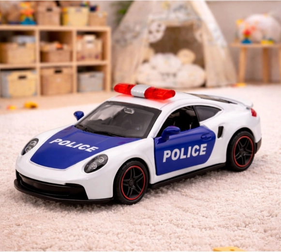 Il modello sportivo della polizia unisce look moderno e funzioni amate dai bambini. Il meccanismo pull-back garantisce una partenza veloce con un solo tiro all’indietro, mentre le porte apribili aggiungono realismo a ogni inseguimento. Grazie alla carrozzeria in metallo e all’accurata lavorazione, la macchinina è resistente e pronta all’azione quotidiana.