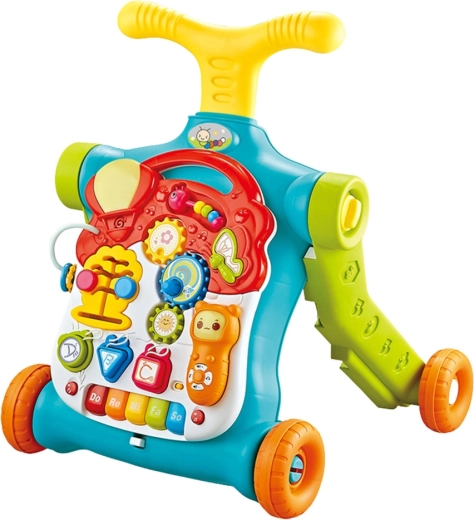 Sul pannello trovi pianola con toni, pulsanti luminosi e sonori, elementi rotanti, incastri di forme, palline e cursori. Grazie a essi i bambini allenano la presa, la logica, la concentrazione e la fantasia. Il blocco delle ruote e la struttura solida aumentano la sicurezza, mentre la plastica di qualità assicura durata.