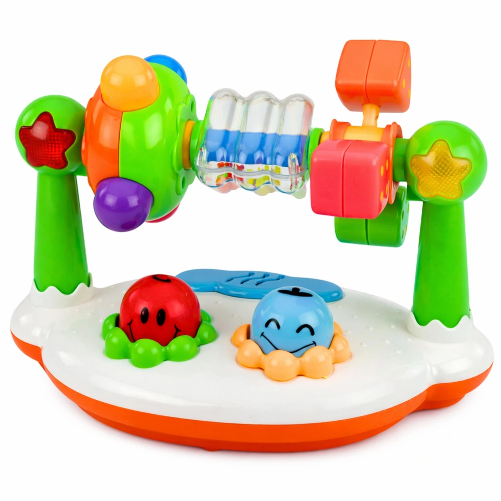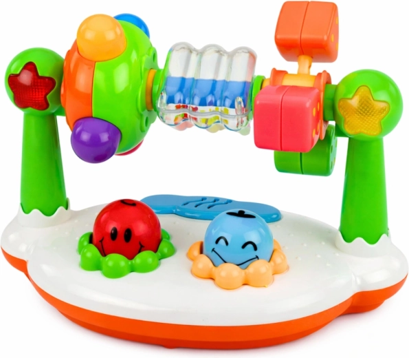 Questo colorato giocattolo musicale interattivo unisce gioco e apprendimento in uno. Attirano il bambino il cilindro trasparente con perline che crea il suono del sonaglino, i pezzi rotanti, gli elementi a stellina e il grande pulsante con luci e suoni. La struttura è stabile e in plastica resistente, adatta al gioco quotidiano in casa.