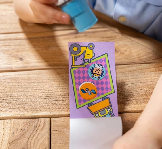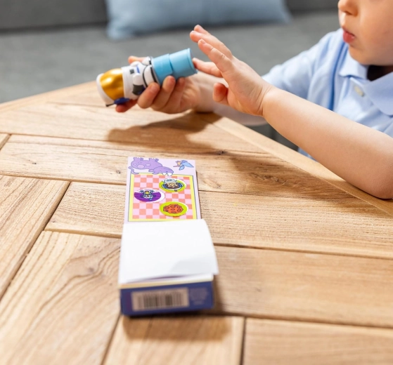 Un’ampia scorta di adesivi con temi di animali, mezzi di trasporto e simboli stimola la fantasia e l’apprendimento divertente.