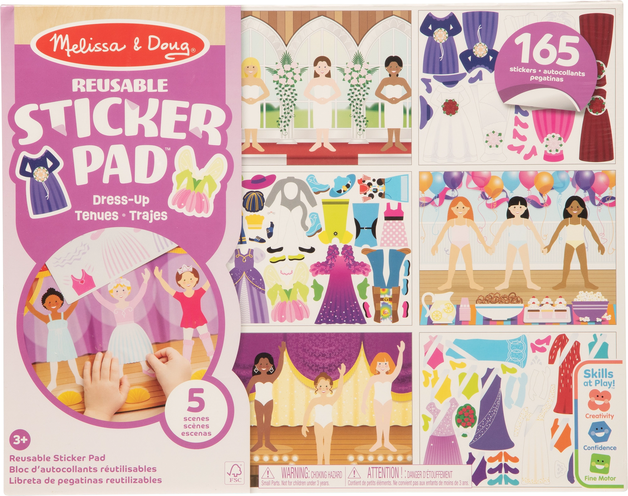 La confezione include 5 piani tematici colorati e 165 sticker riutilizzabili con abiti e accessori. Le robuste tavole a formato libro si trasportano facilmente, risultando perfette a casa e in viaggio.