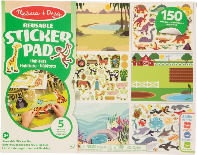 Divertente set di adesivi e scenari Sticker Pad con ambienti di animali di MELISSA & DOUG che offre 150 adesivi riutilizzabili e 5 grandi tavole colorate (fattoria, safari, giungla, prato, mondo sottomarino). I bambini possono creare storie, sviluppare creatività e motricità fine senza disordine – ideale anche in viaggio.