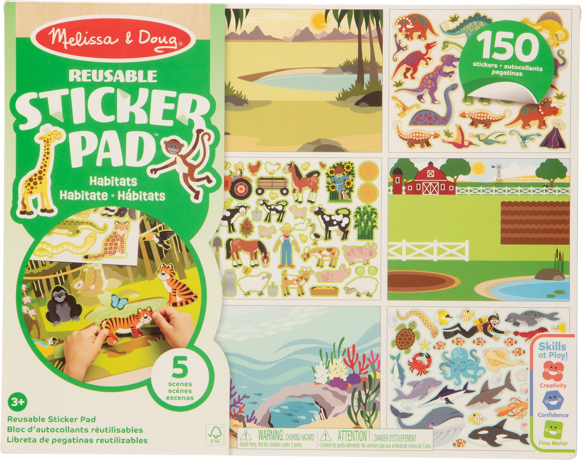 Nella confezione troverete 5 grandi scenari con ambienti preferiti (fattoria, safari, giungla, prato, mondo sottomarino) e 150 adesivi colorati di animali e accessori. Le tavole rigide e il formato senza colla garantiscono divertimento pulito a casa e in viaggio.