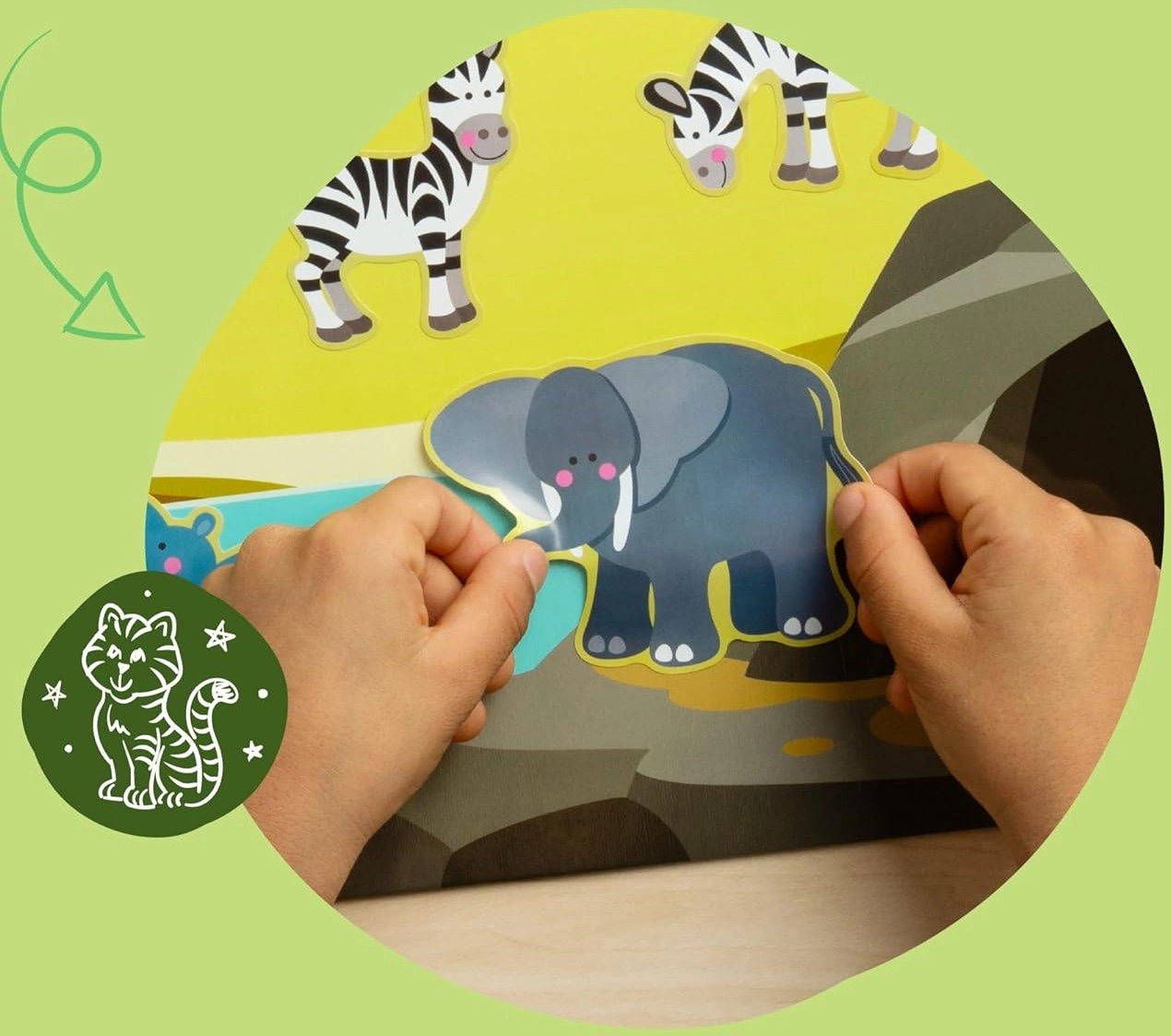 Una varietà di animali e accessori può essere incollata e riposizionata più volte. I bambini creano le proprie scenette senza limiti, sviluppando creatività e motricità fine.