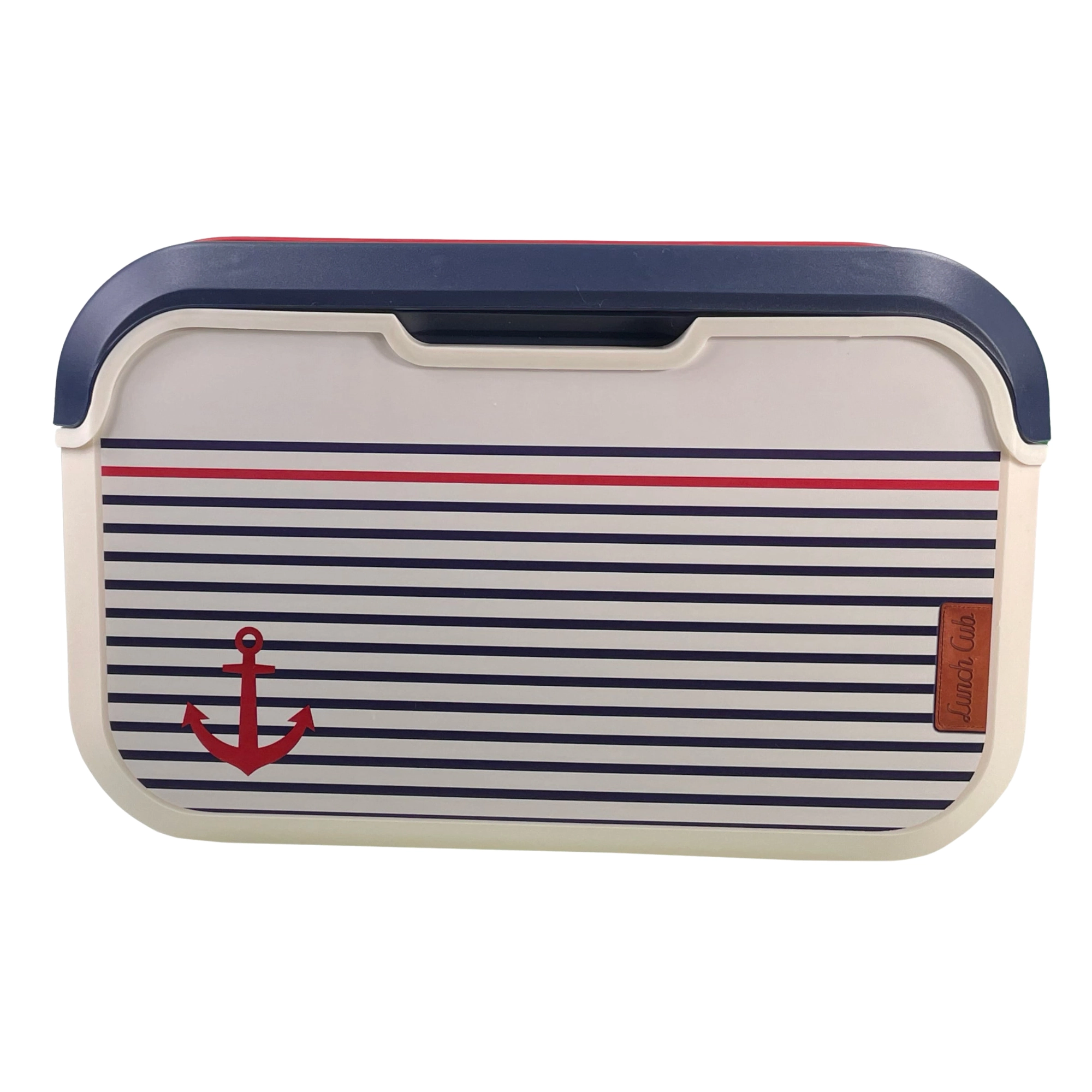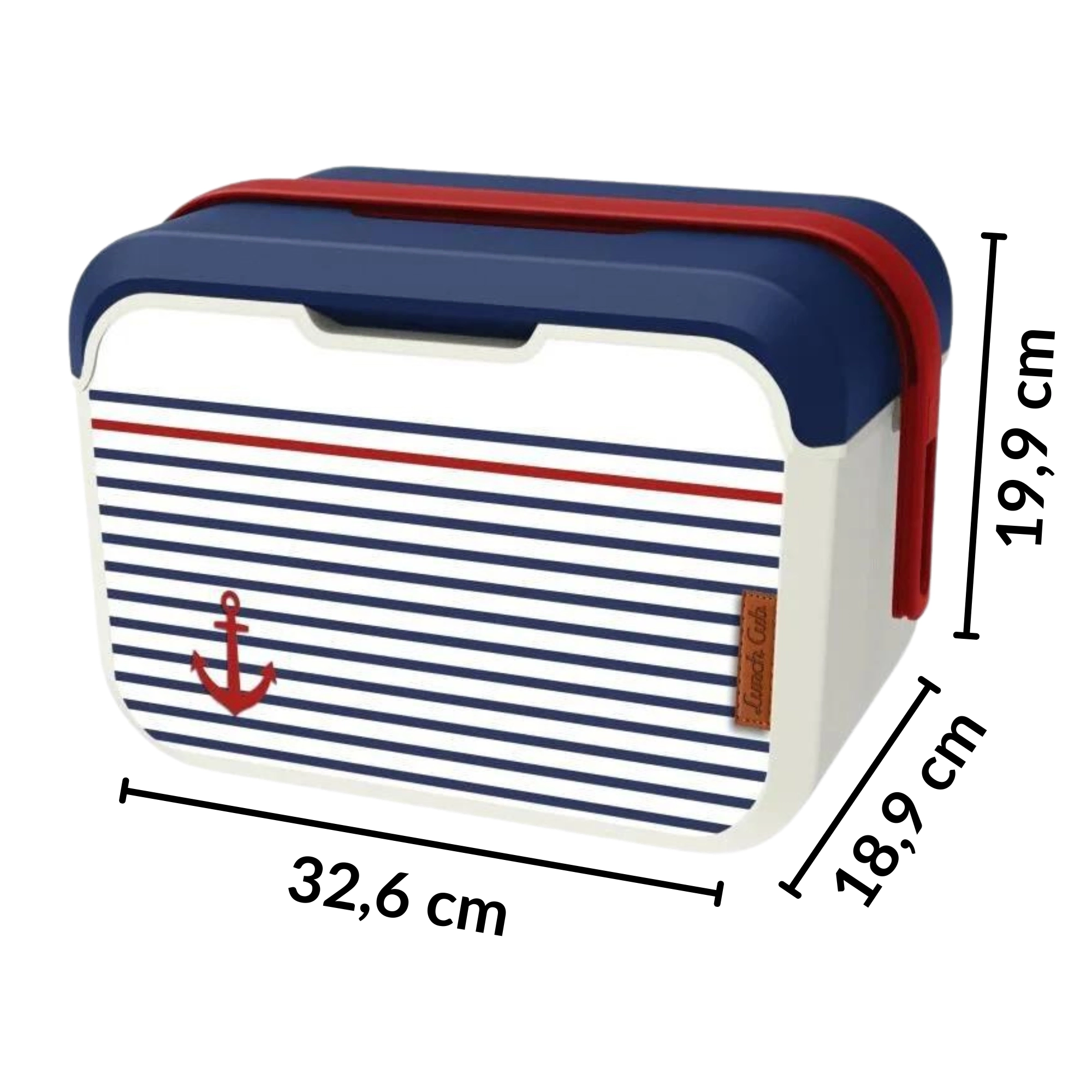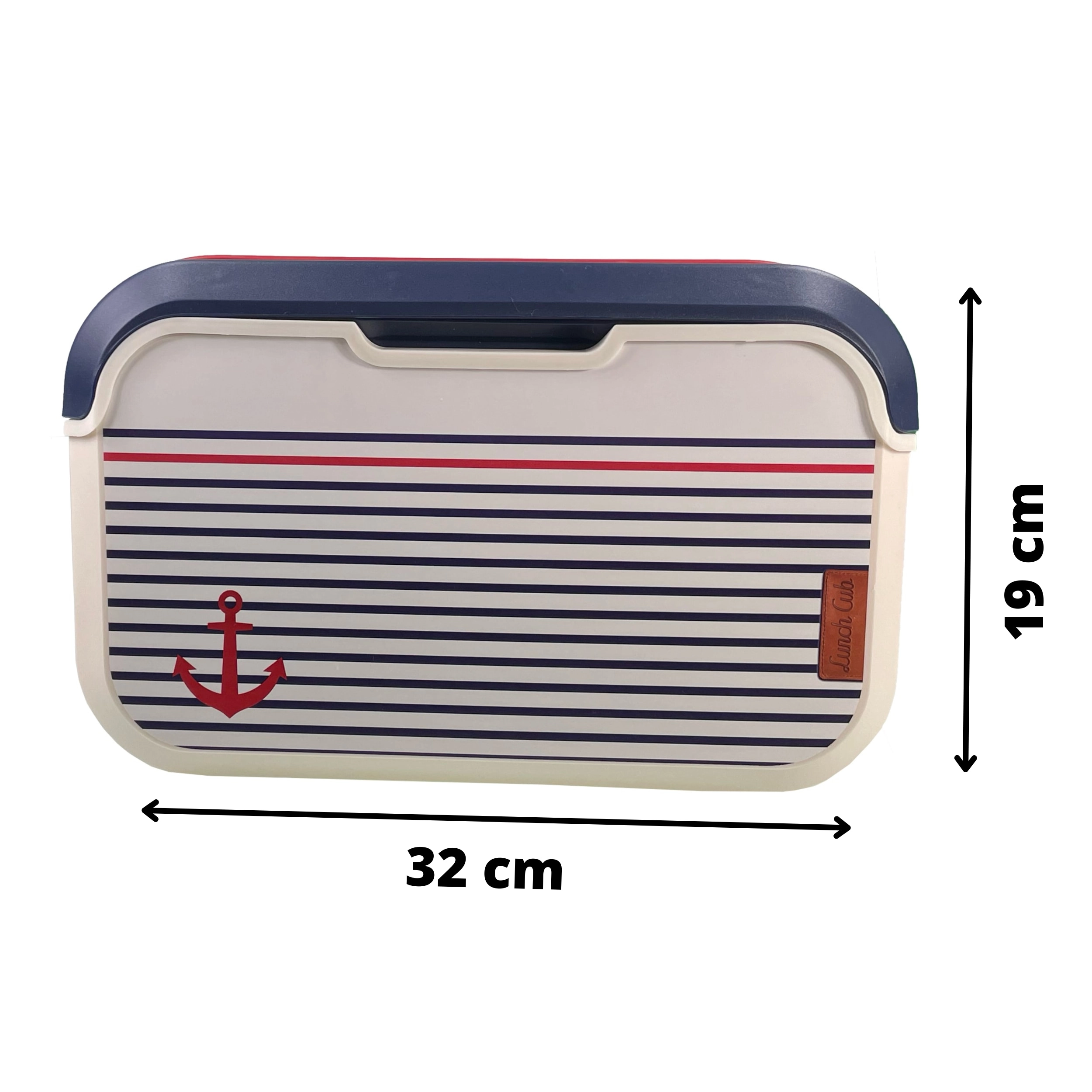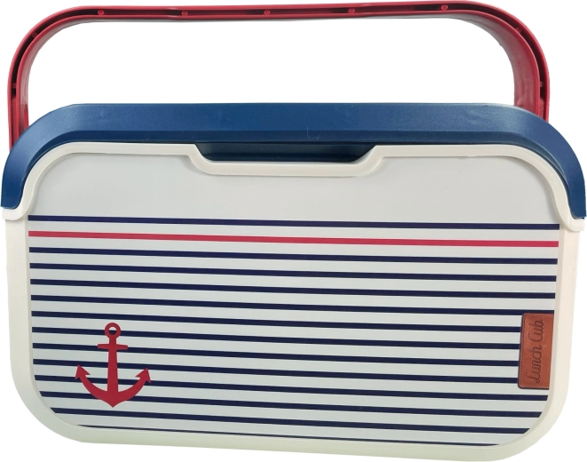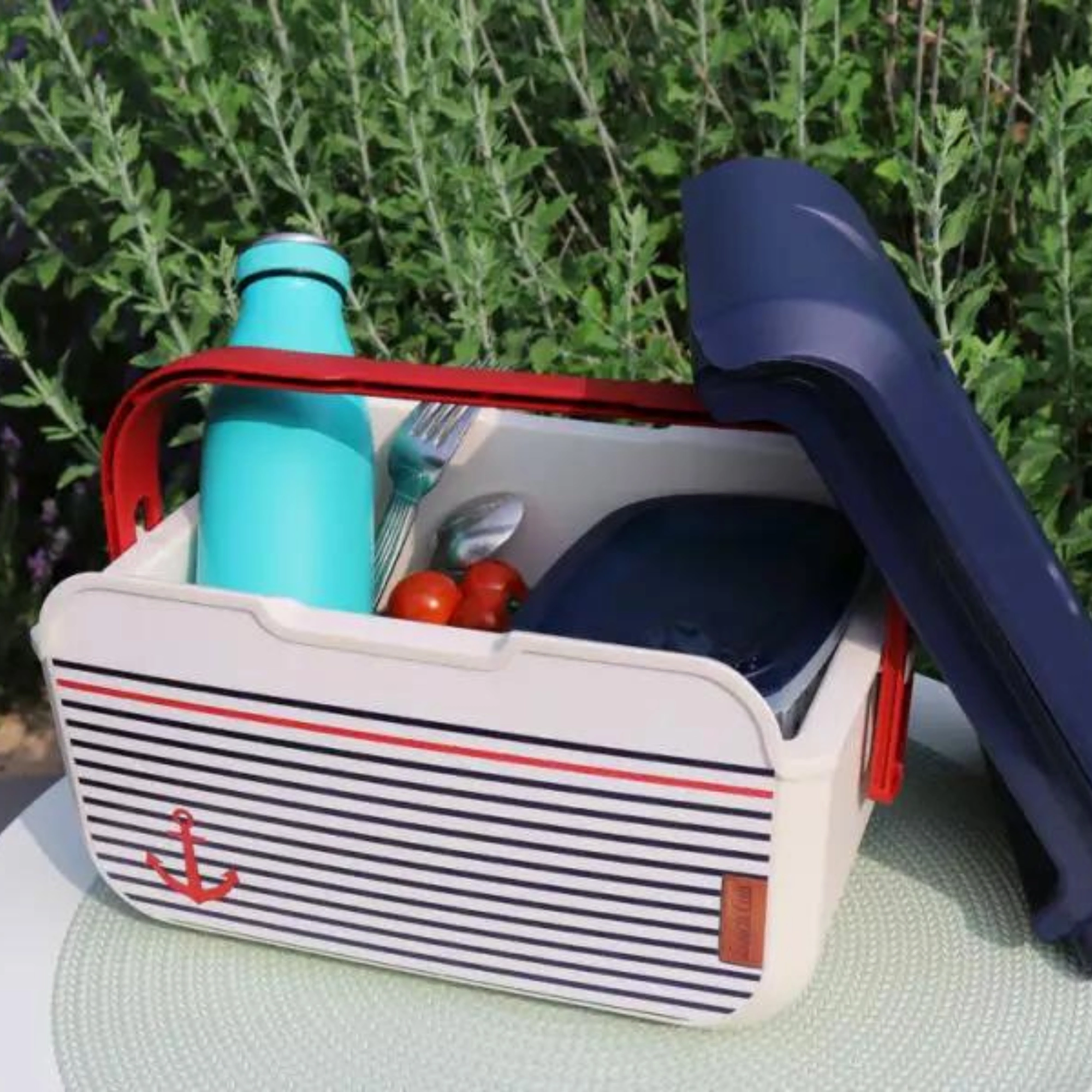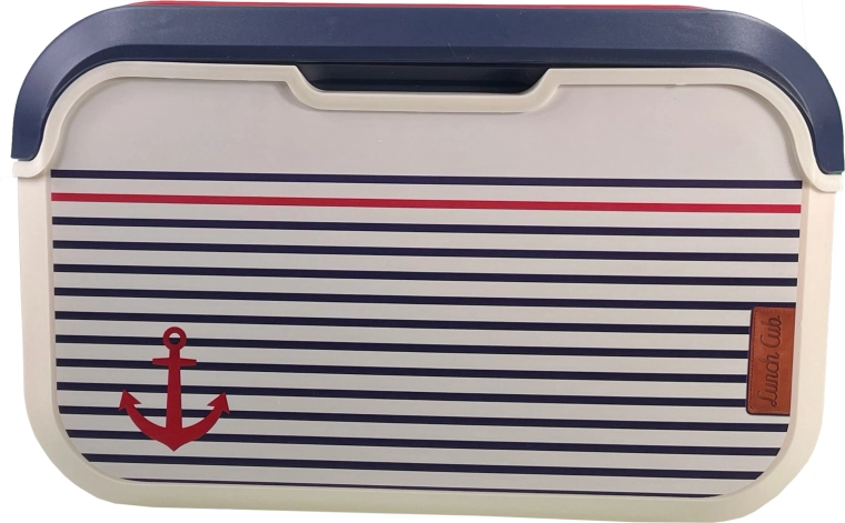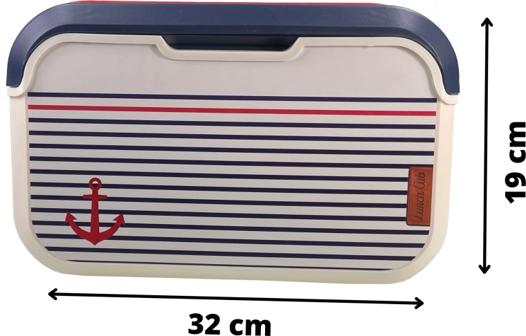 Prodotto in Europa (Francia) secondo le norme europee per il contatto con alimenti. Il corpo in polipropilene di alta qualità è leggero, resistente e facile da lavare: basta una spugna umida e una goccia di detersivo per piatti. Il raffinato motivo marinaresco con ancora, il corpo color vaniglia e il coperchio blu sono completati da una maniglia rossa per un trasporto confortevole.